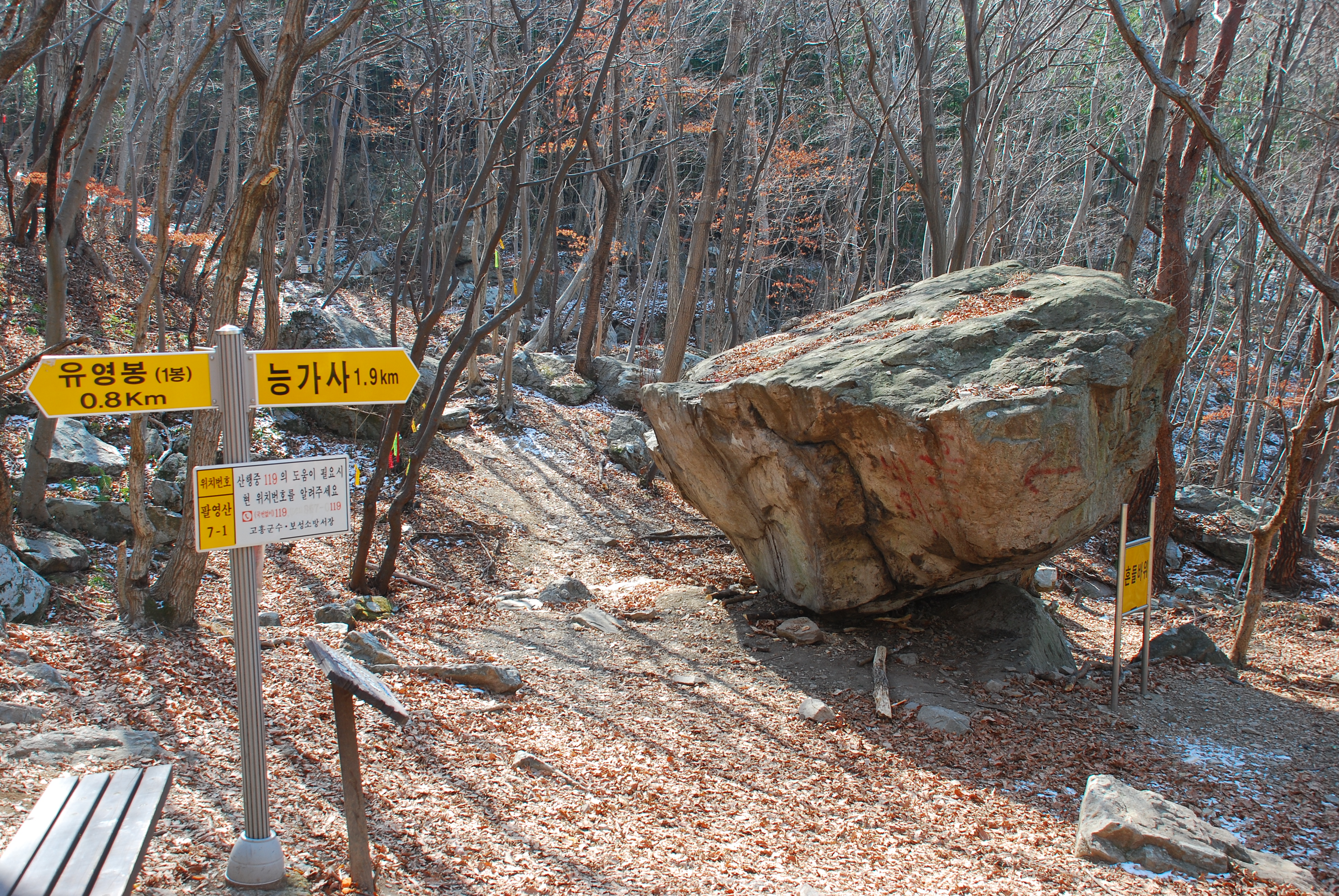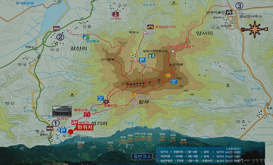 ①능가사에서 시작하여 1봉부터 8봉까지 죽 밟고 입가심으로 9봉 깃대봉에 올라 지나온 봉우리를 구경하는 재미를 만끽한 다음 남쪽 산 기슭으로 내려와 능가사로 되돌아 오는 코스가 있고, ②서쪽에 있는 곡강마을에서 시작하여 선녀봉을 거쳐 3봉부터 8봉, 그리고 깃대봉을 탄 후 능가사로 내려 오는 코스가 있습니다. 소요 시간은 ①코스는 4~5시간, ②코스는 5~6시간으로 보시면 됩니다.