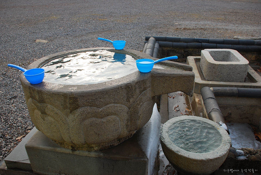 다시 능가사로 되 돌아와 경내 우물에서 시원한 약수를 한잔 들이키다. 마시고 난 뒤 빈 잔을 올려두면 툭 떨어지기 때문에 반드시 물을 반쯤 채워 올려 둬야 한다.