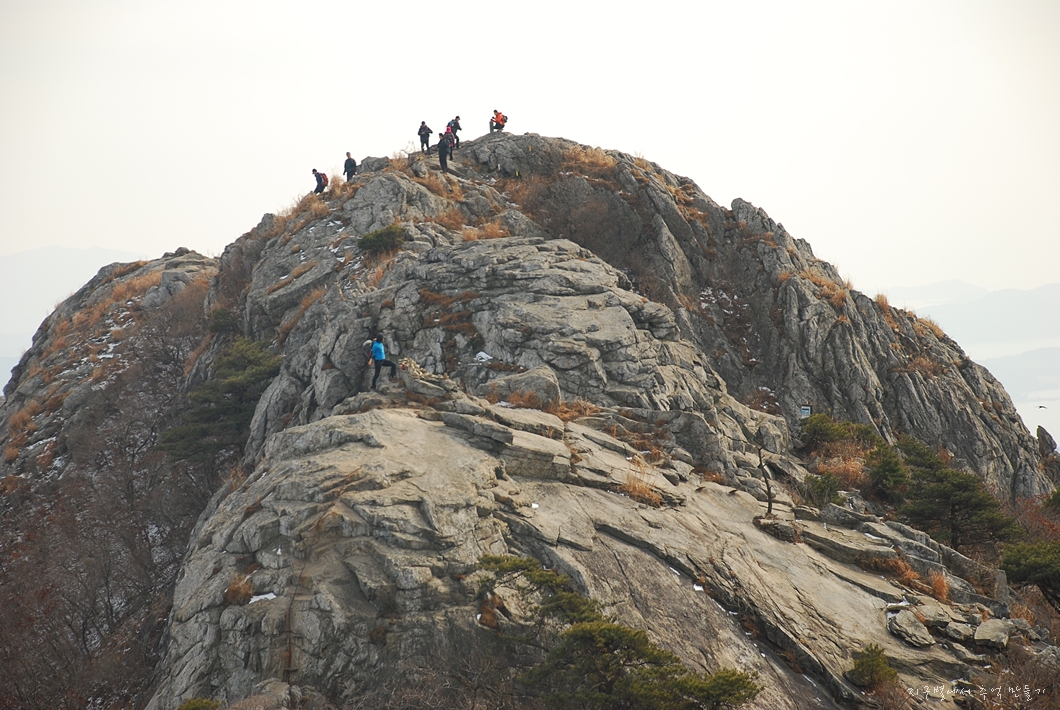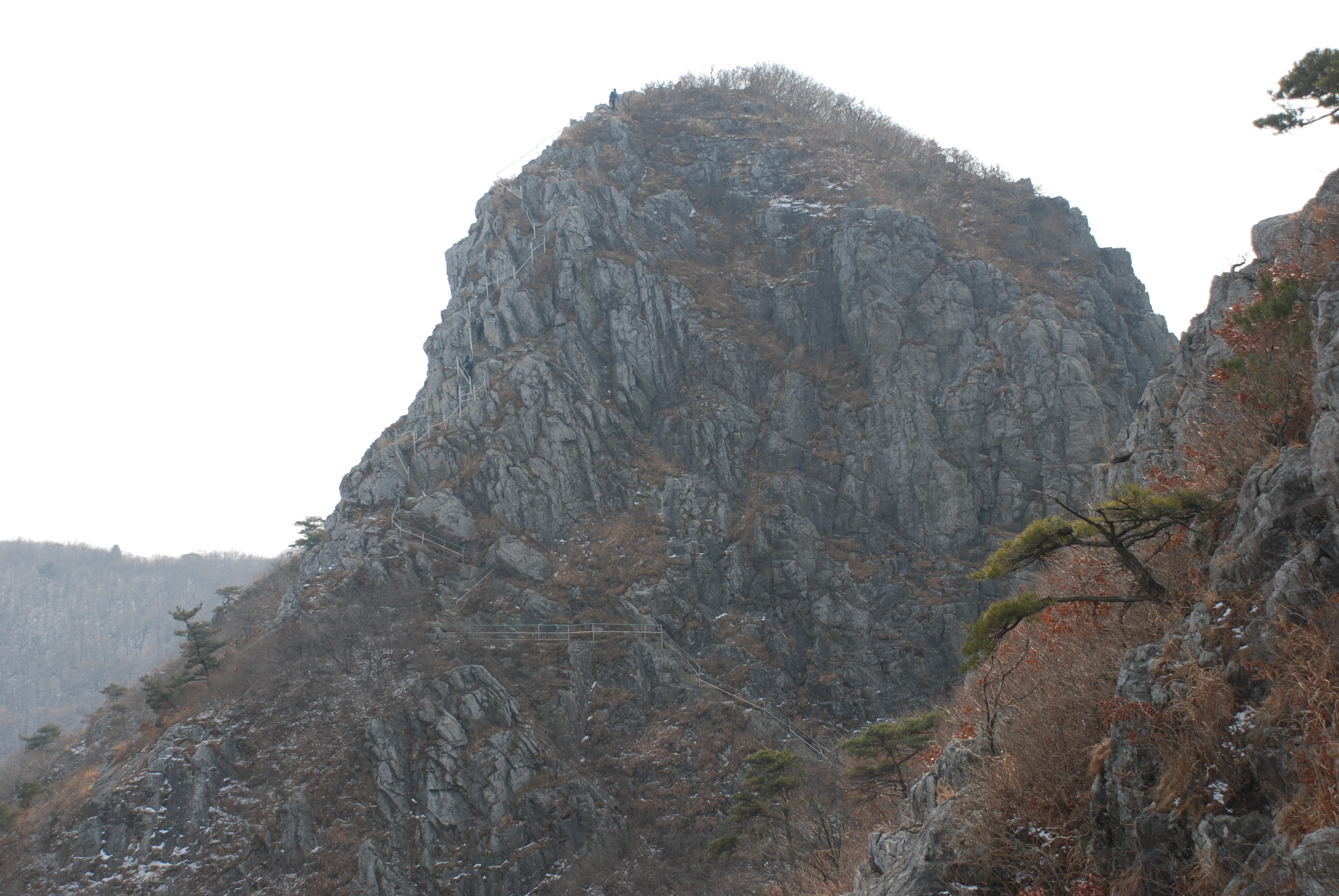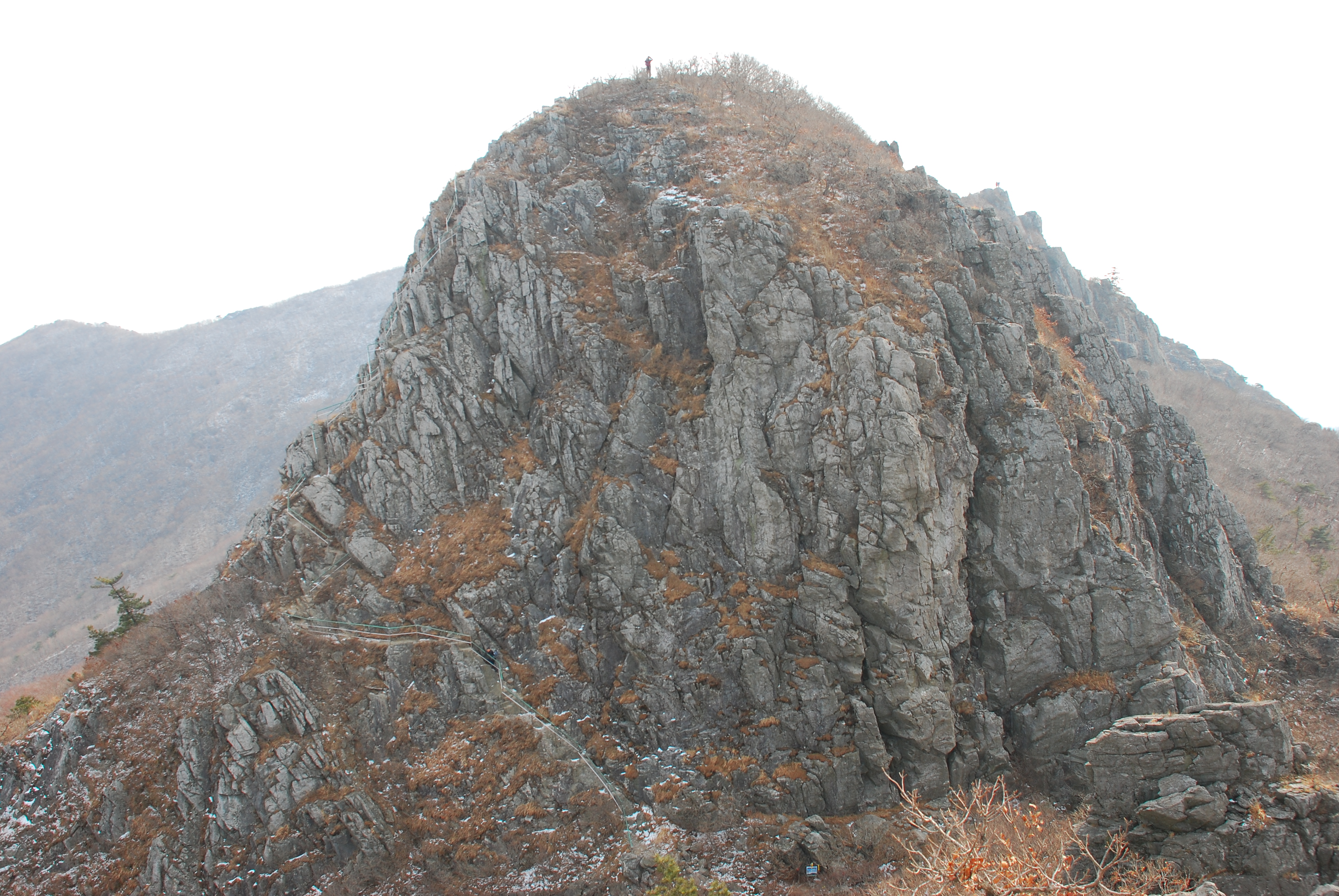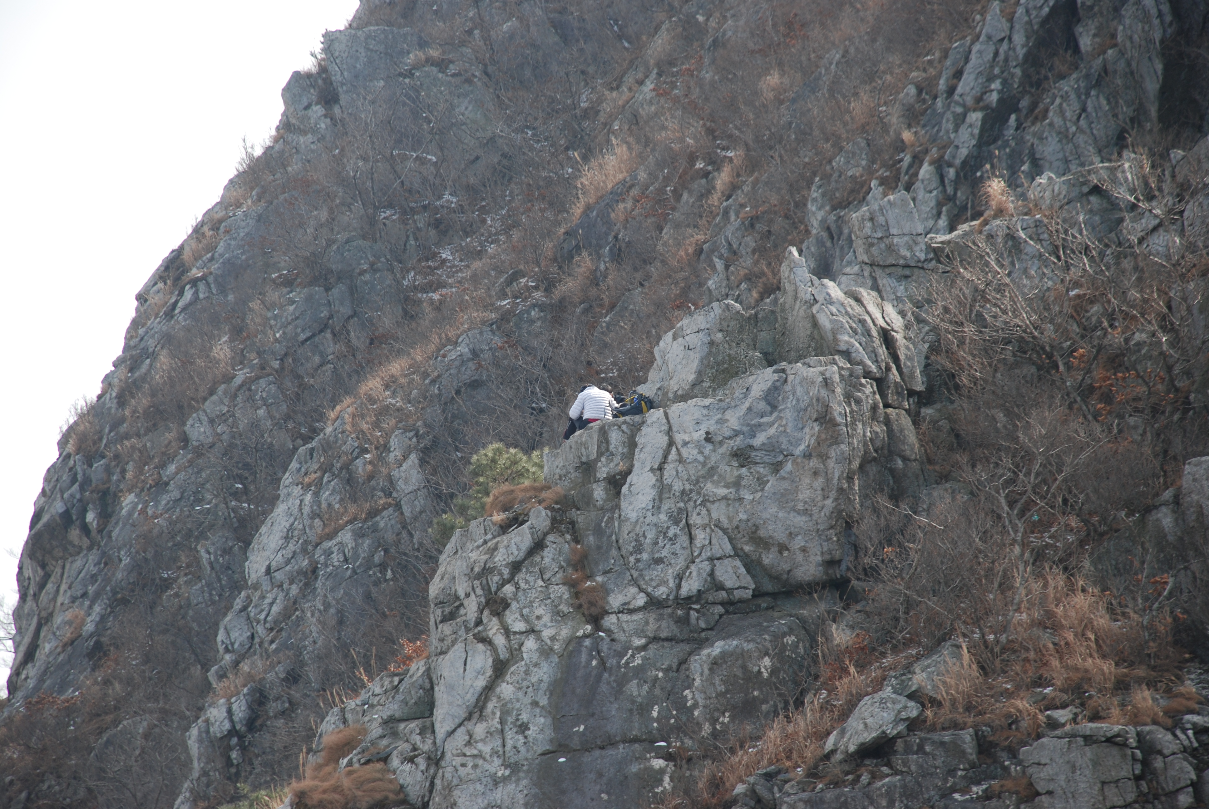 조금 늦게 도착하여 산에 오르다 보니 얼마 오르지 않아 식사때가 되었다. 멀리 아주 위험한 벼랑 끝에 누군가가 자리하여 오찬을 즐기고 있다.(하얀 원 안)