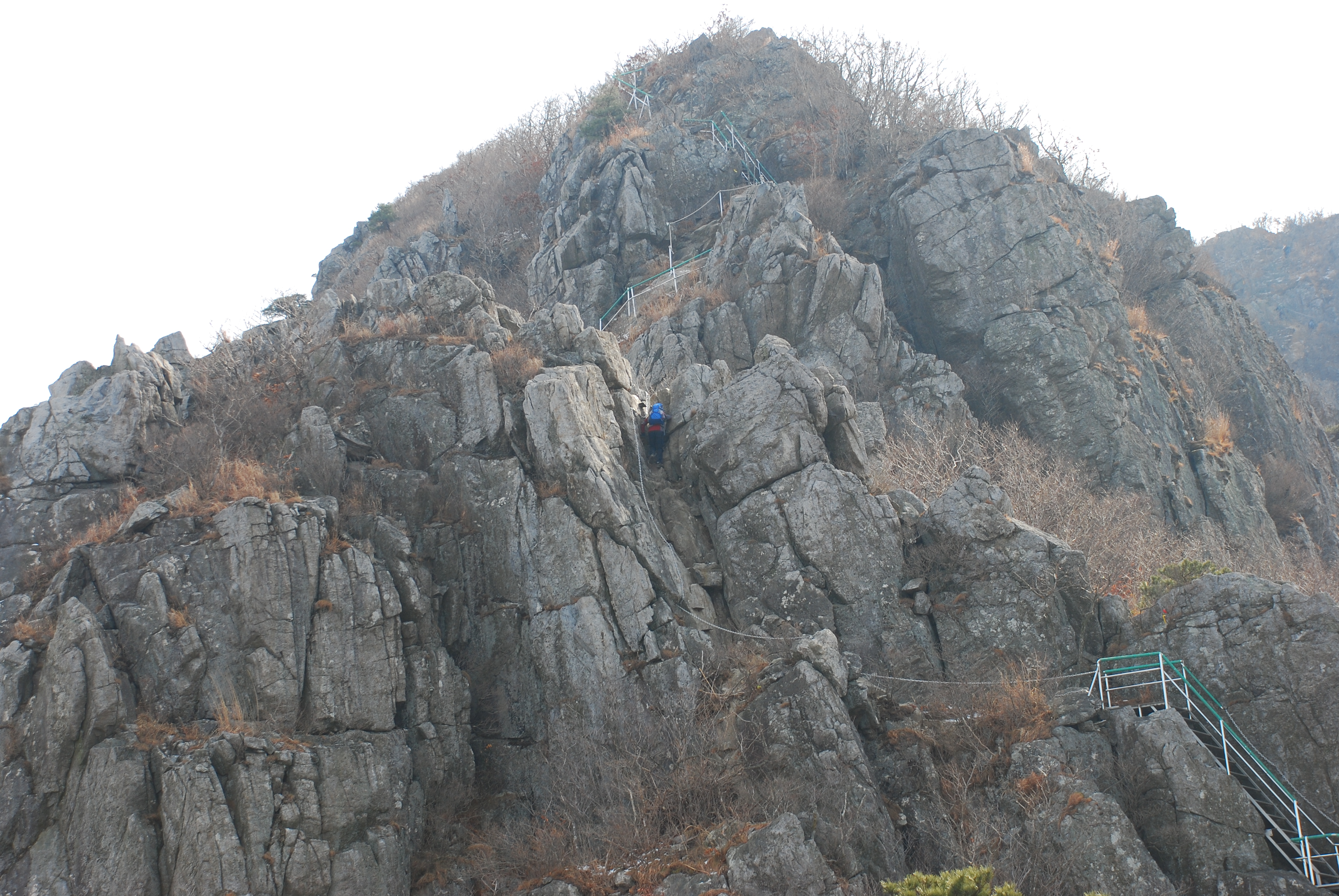 8개의 봉우리는 모두가 세미 클라이밍 수준의 암릉산행을 만끽하게 되어 있으며 봉우리 정상에는 모두 위와 같이 각각의 표시가 되어 있다. 4봉인 사자봉을 오르면서 5봉인 오로봉의 암봉을 오르는 이들을 감상한다. 바위틈 사이로 이리저리 연결된 철 사다리로 오르는 산꾼들이 보인다.