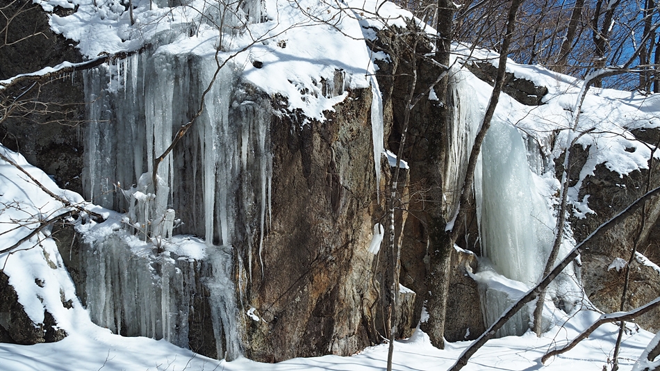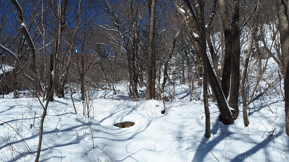눈 밑에 얼음이 꽁꽁 얼어있는 곳들이 등산로에 산재합니다.