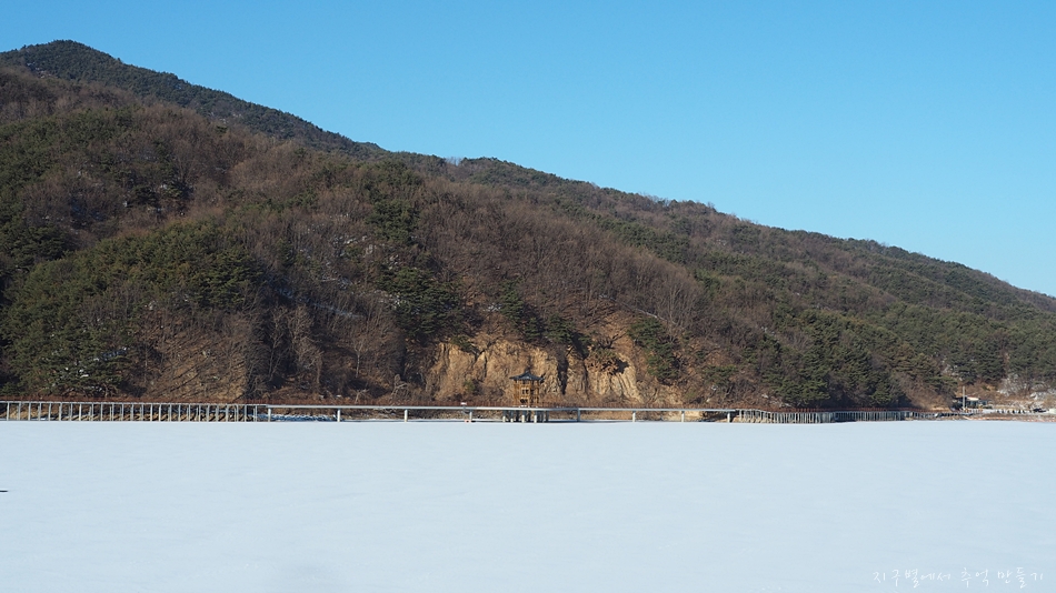 꽁꽁 언 저수지 위로 눈이 소복히 내린 모습이 여간 운치있는게 아닙니다.