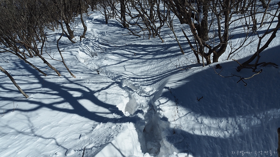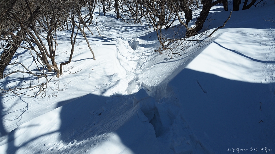 능선으로 몰아쳐 몰린 눈들로 허벅지까지 푹푹 빠지는건 그렇다치고 길을 찾을 수 없습니다.