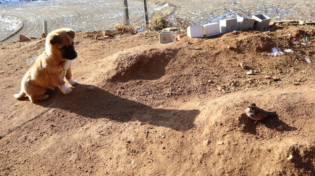 복돌이 녀석이 하도 멍멍 짖어대서 사료를 주러 나갔습니다.
