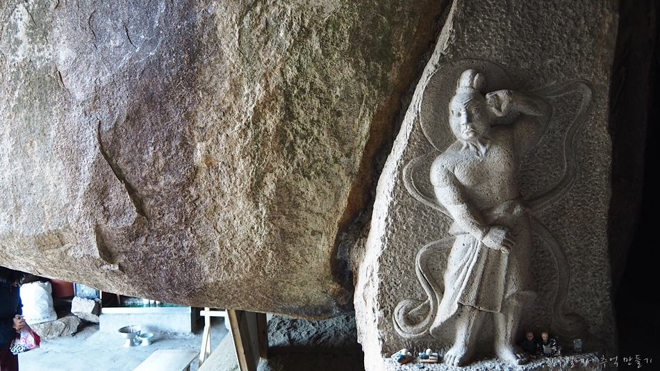 중앙 석벽에는 부처님이 양쪽에 인왕상이 새겨져 있습니다.