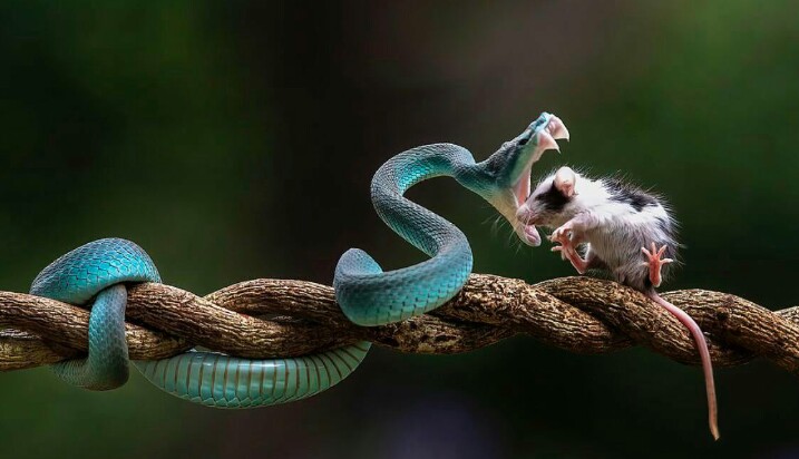 쥐를 잡아 먹으려고하는 푸른 뱀의 순간포착