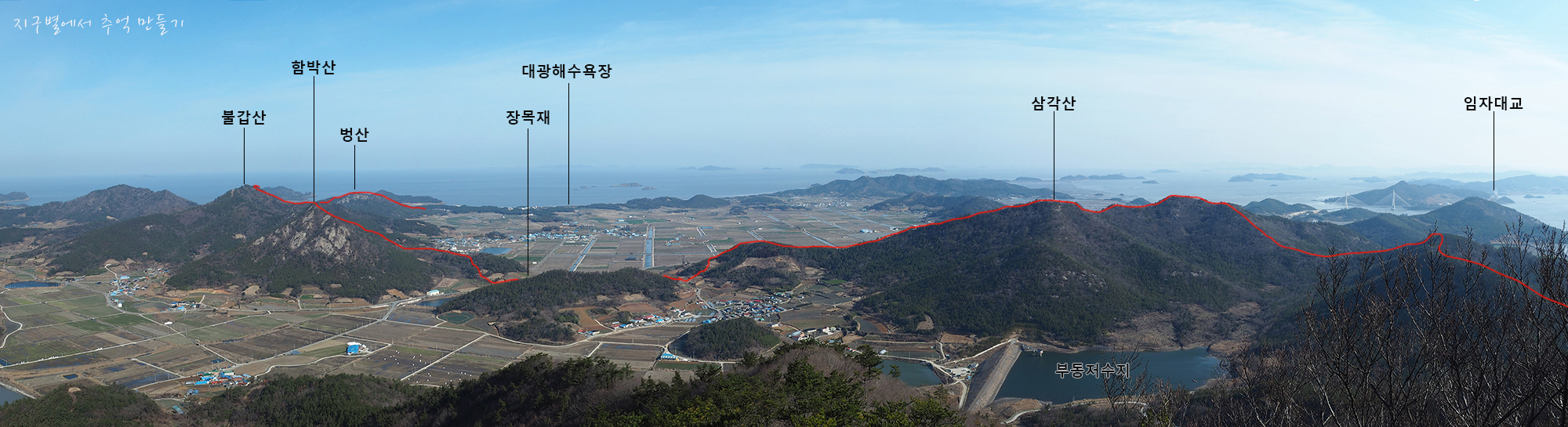 산행코스 : 원상리 - 대둔산(320m) - 부동재 - 삼각산(212m) - 장목재 - 함박산(197m) - 불갑산(224m) - 벙산(139m) - 광산해수욕장