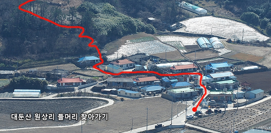 함박산에 올라서 내려다 본 원상마을을 보면서 들머리를 표시하였습니다.