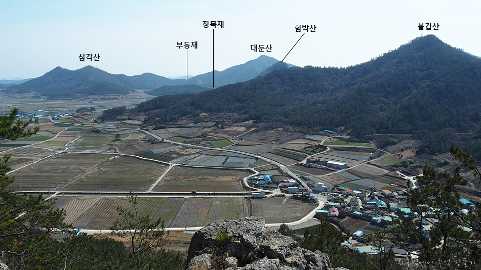 삼각산에서 건너보이는 함박산(좌측)과 불갑산(중앙), 그리고 오른편 끝이 마지막 봉우리인 벙산입니다.