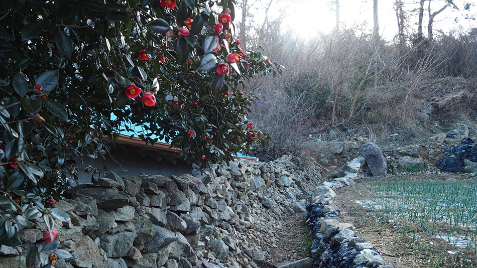 동네 마지막 집을 돌아 올라가는데 붉은 동백이 담장위에서 쳐다보고 있습니다.