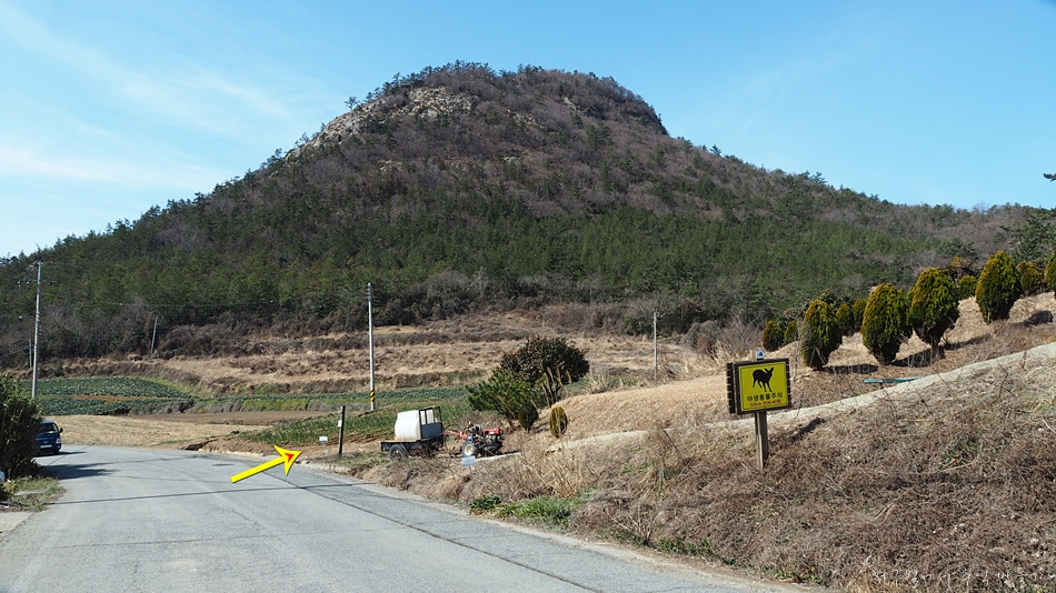 함박산 들머리는 도로를 따라 내려가서 좌측 고개를 살짝 넘어가면 우측으로 안내판이 세워져 있습니다.
