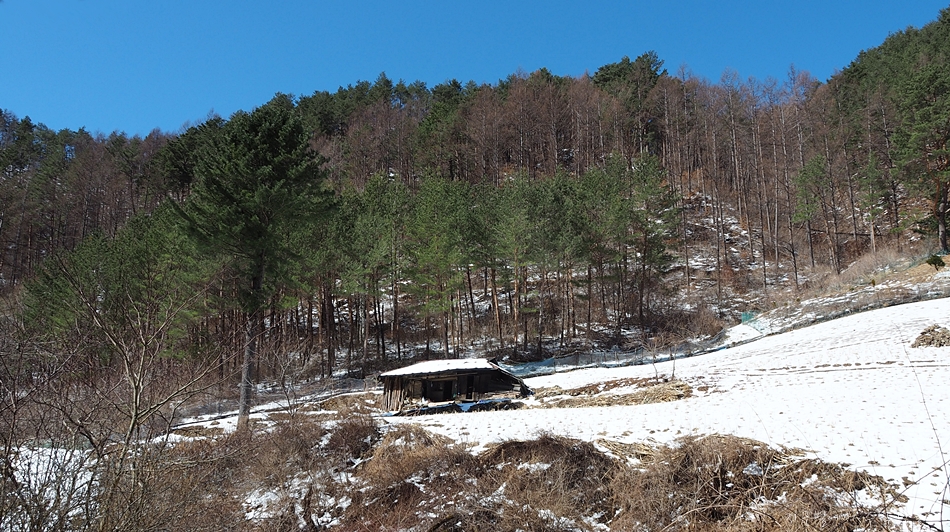 칠성암으로 오르는 포장도로 한 옆 넓직한 밭에 외로운 집 한채.