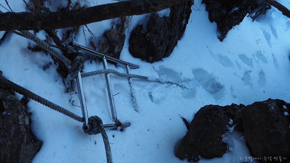 밧줄이 눈 속에 얼어 박혀 빠지지 않아 뭘 잡고 올라야 하는데...