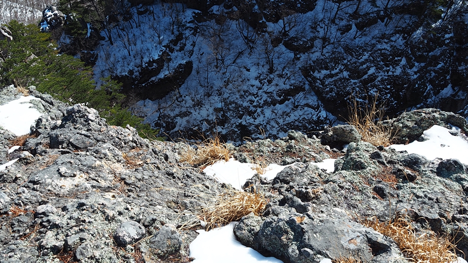 절벽을 내려다보며 바위를 잡고 눈 속에 한발 한발 아이젠을 박아가며 후퇴.