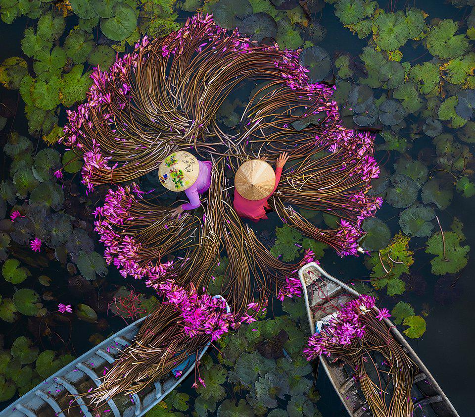 20. 수련을 씻는 2명의 여성을 드론 촬영 (Chau Doc, 베트남)