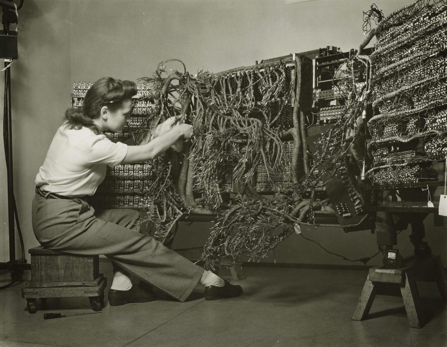 8. 1958년 초기 IBM 컴퓨터를 연결하는 엔지니어