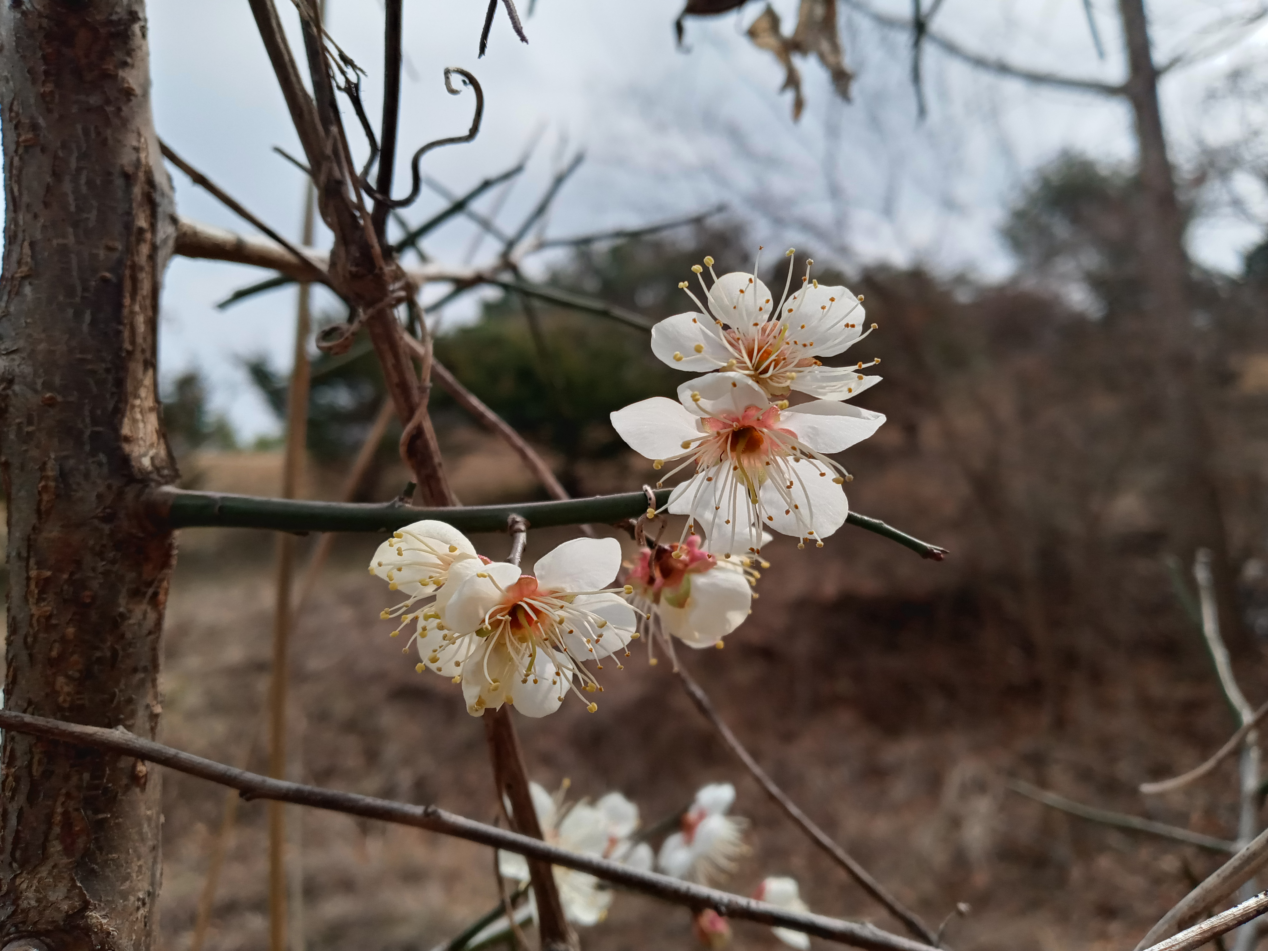 산책 중 산 중턱에 야생 매화꽃을 보고, 길도 없는 비탈길을 올랐습니다.