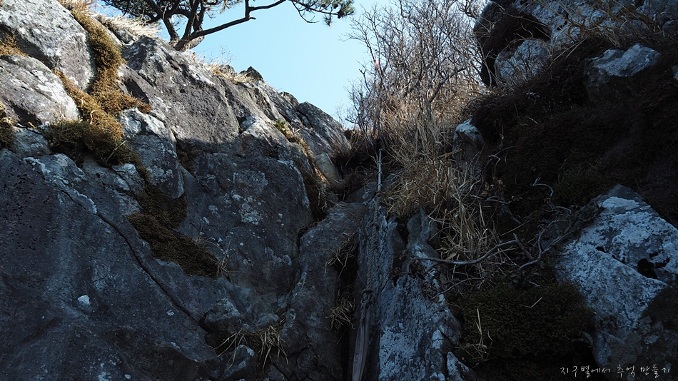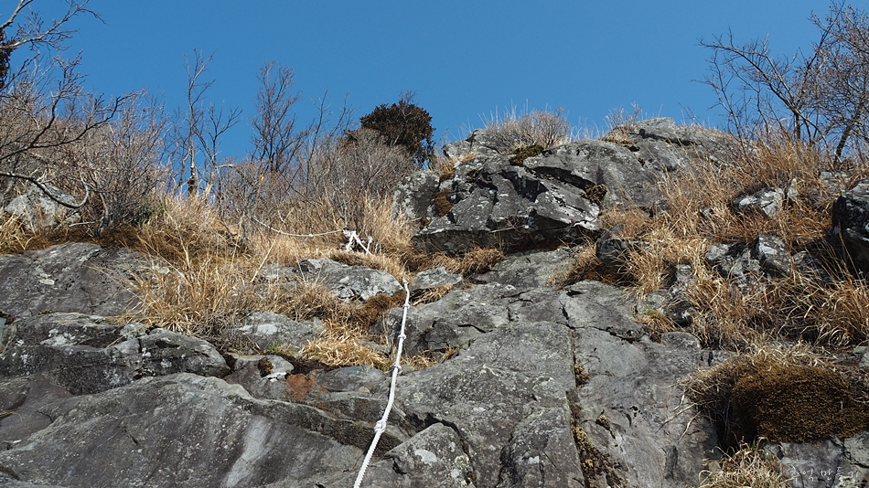 정상 바로 뒤로 빨래줄같은 노끈이 매달린 10m 높이의 암벽구간이 있는데 전 구간에서 가장 난이도(?) 높은 장소입니다.