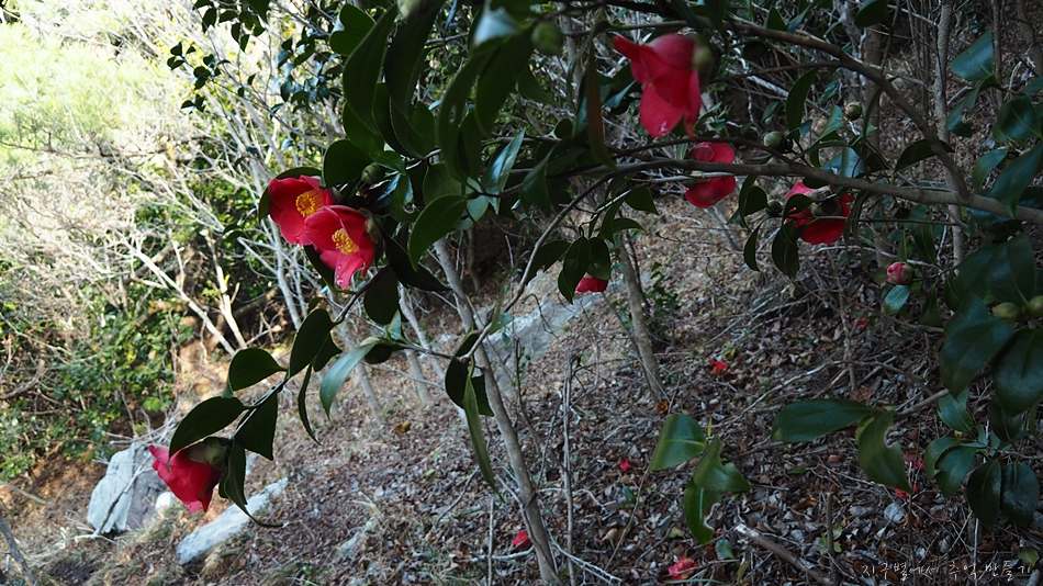 반 정도는 떨어져 있고 반 정도는 붙어 있는데 산행 내내 동백군락지를 한없이 지나게 됩니다.