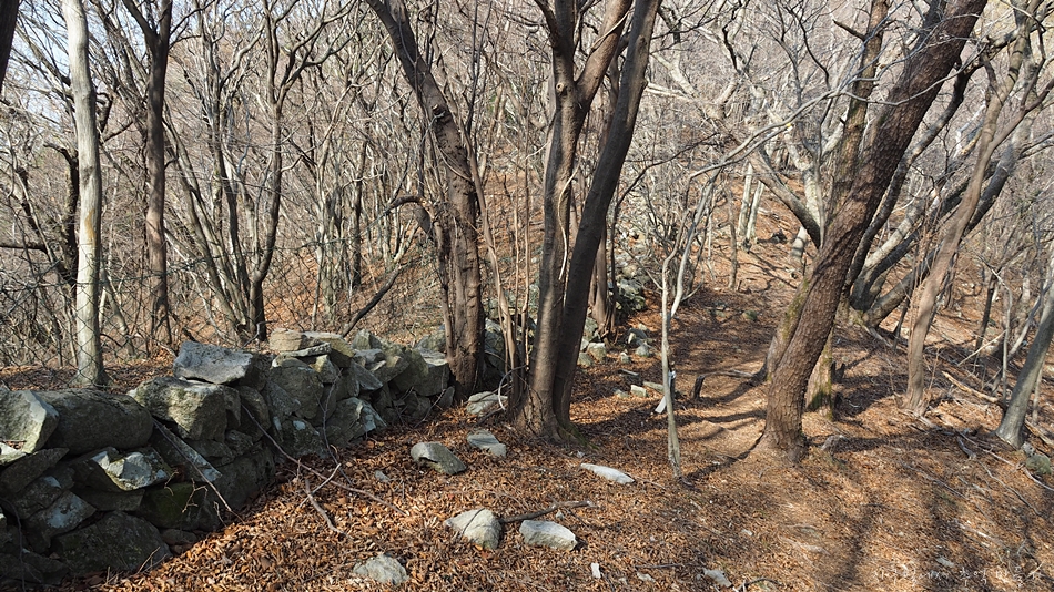 정상으로 가는 능선길에는 이처럼 돌담들이 이어져 있는데 산성은 아닌듯하고 중간 중간 그물망이 곁들여져 있는걸 보니 이전에 염소를 방목하면서 만든 담이 아닐까 생각도 되네요.