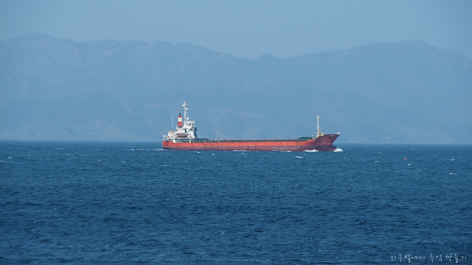 유조선인듯. 배 뒤로 보이는 섬은 사량도.