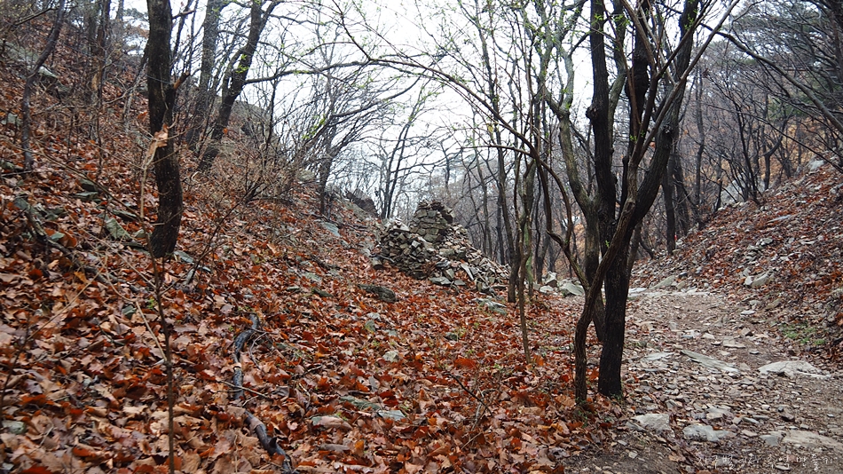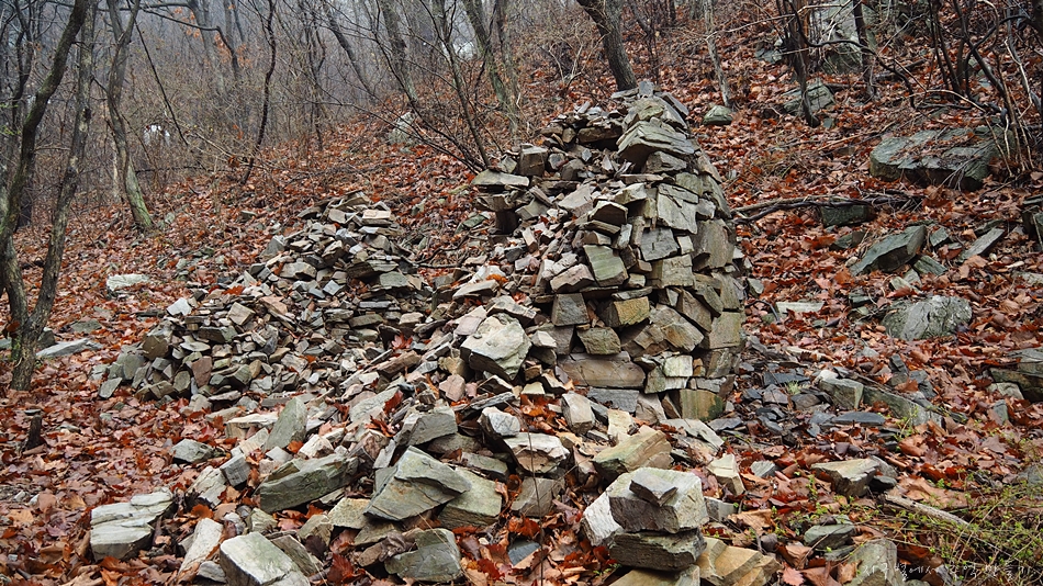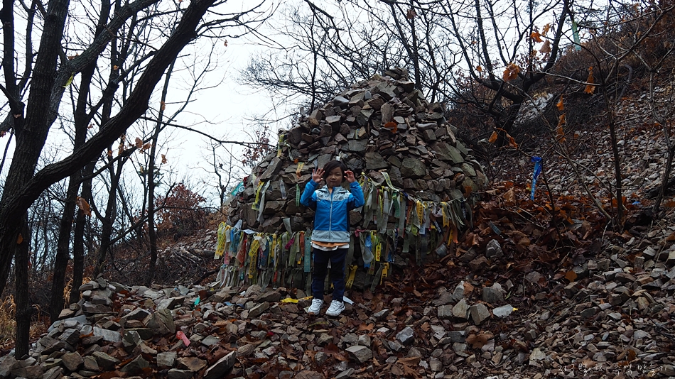 중간에 무너지지 않은 돌탑이 있고 이곳 찾은 산악회와 개인들의 리본이 무당집 처마밑처럼 요란스럽습니다.