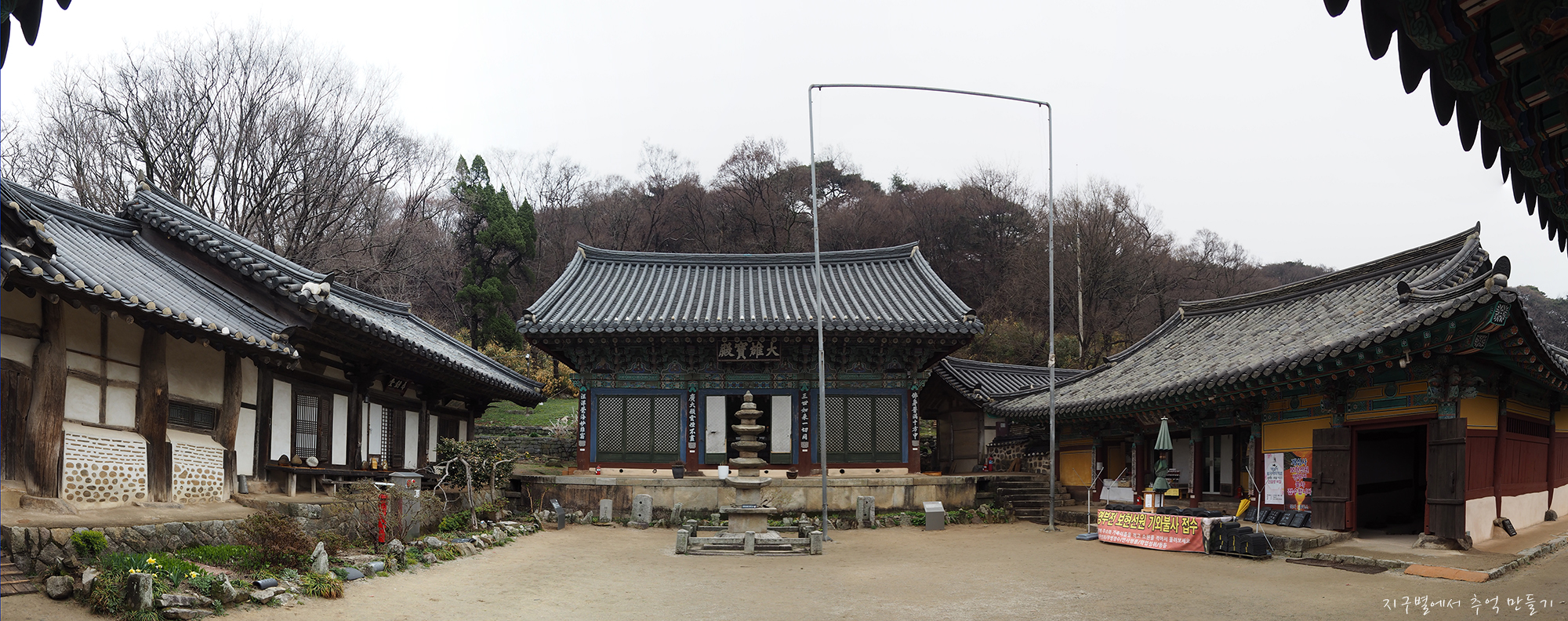 대웅전을 중앙으로 하여 와이드하게 보는 개심사 경내 풍경