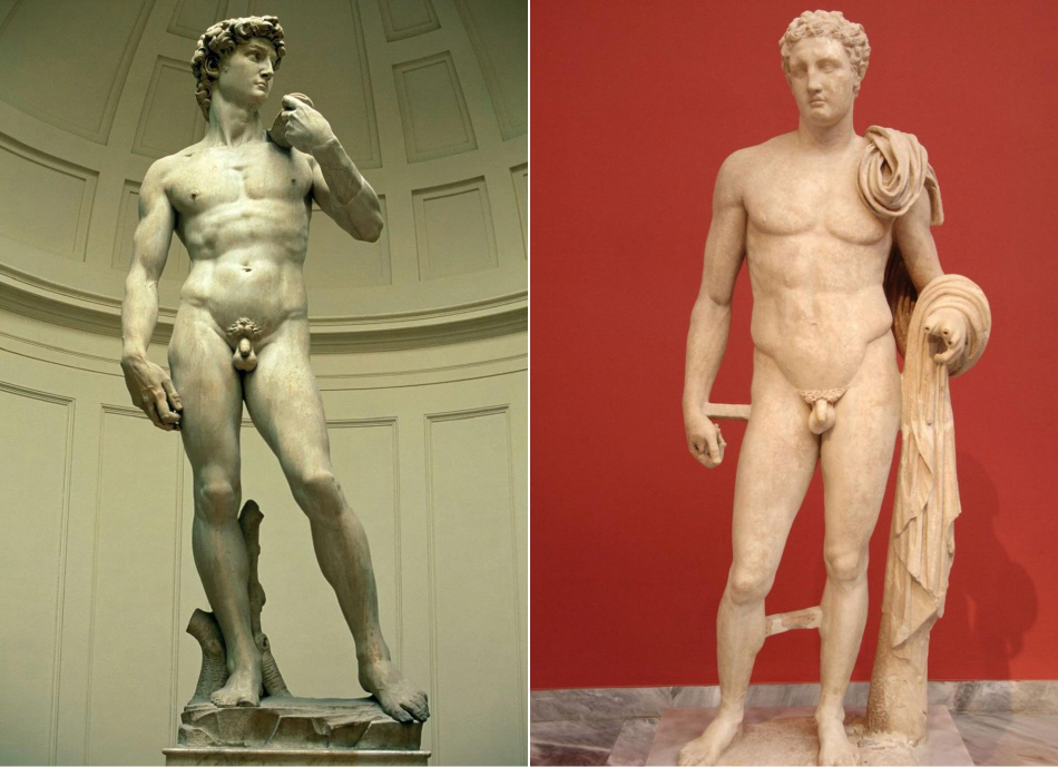 12. 고대 그리스에서는 작은 성기가 높은 지능과 자제력의 표시로 생각되었답니다. 큰 성기를 가진 남자는 기괴하고, 웃기고, 야만적이었다고 하여 대개의 조각은 이렇게 번데기처럼 거시기를 만들었네요.