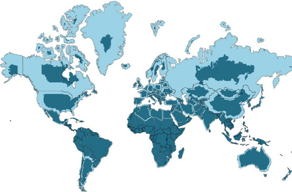 1. 우리가 보는 대부분의 지도는 평면입니다. 따라서 구형으로 보는 각 국가의 크기를 정확하게 표시하는 것은 어렵습니다. 이 그림은 평면 지도상의 나라의 크기가 실제와 얼마나 다른지를 보여 줍니다. 적도에 더 가까울수록 일반적인 지도와의 차이가 적습니다.
