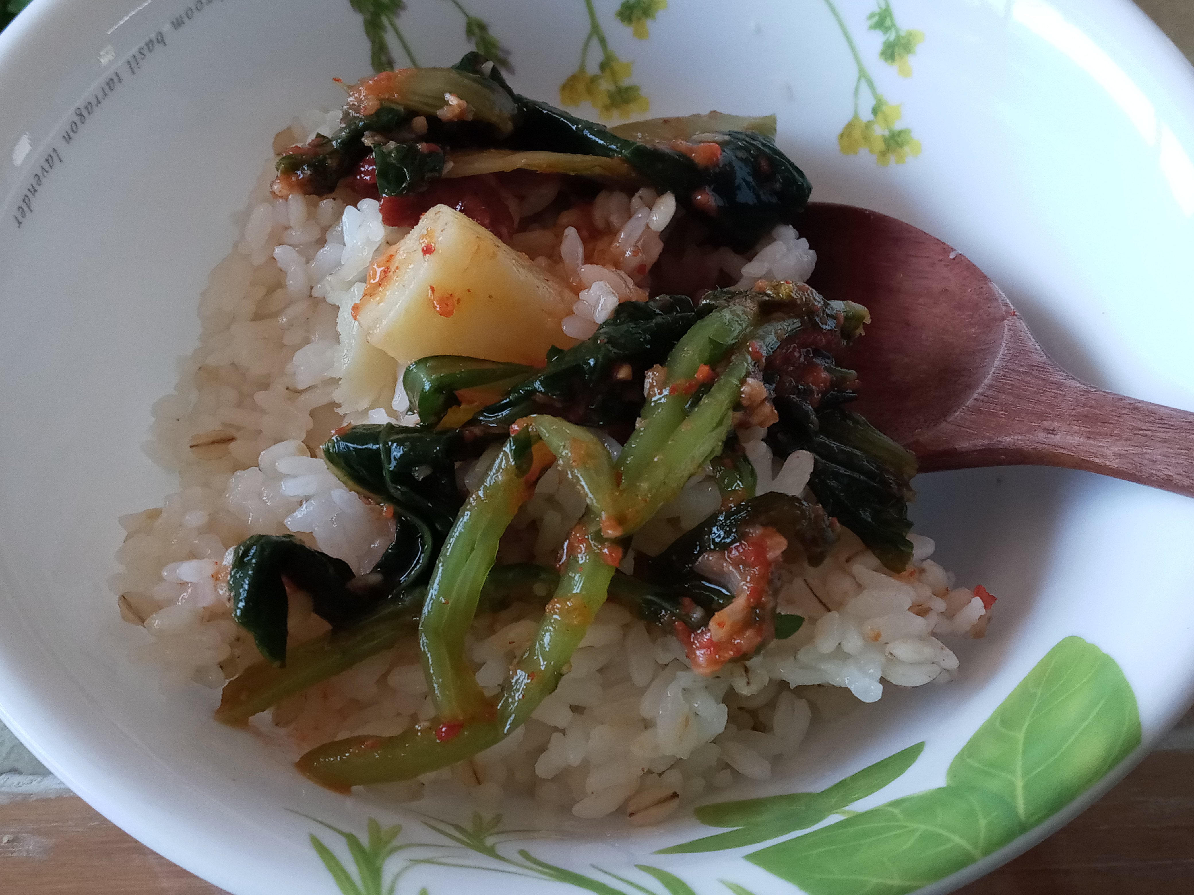 나머지 반은 열무김치 넣고 고추장으로 비빈 후 마무리로 참기름 살짝 넣어서 먹습니다.
