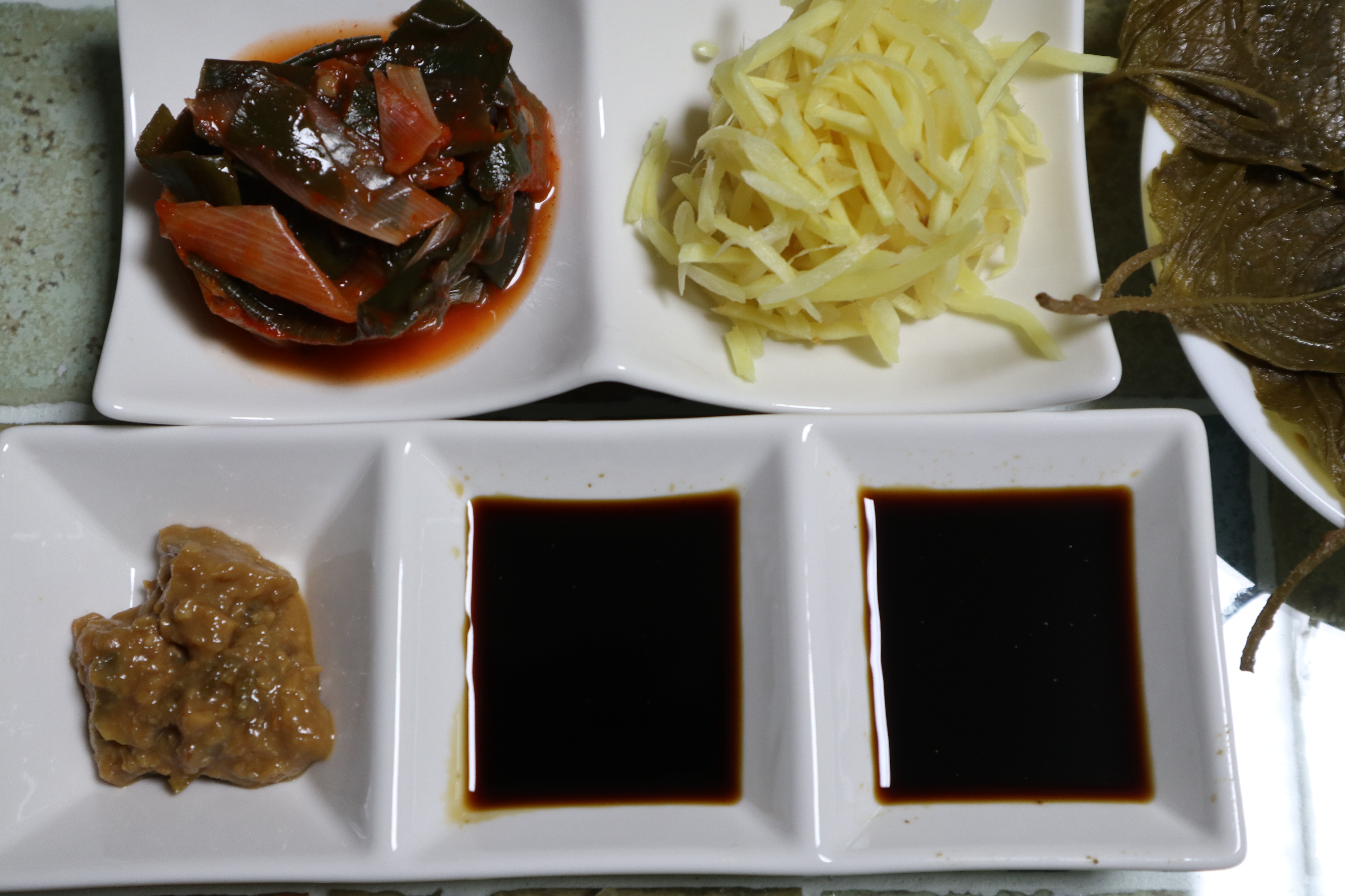 된장에 잘 삭힌 깻잎 장아찌에 파김치와 생강을..
