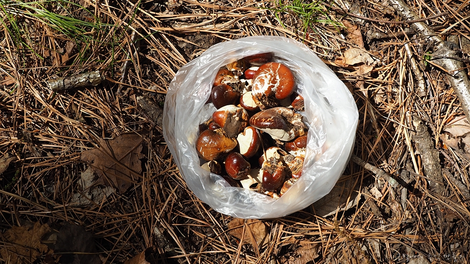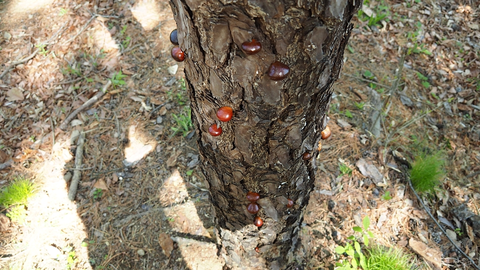 죽은 소나무에 자라나는 버섯인데 키 높이 위로는 따지 못하고 적당하게 수거.