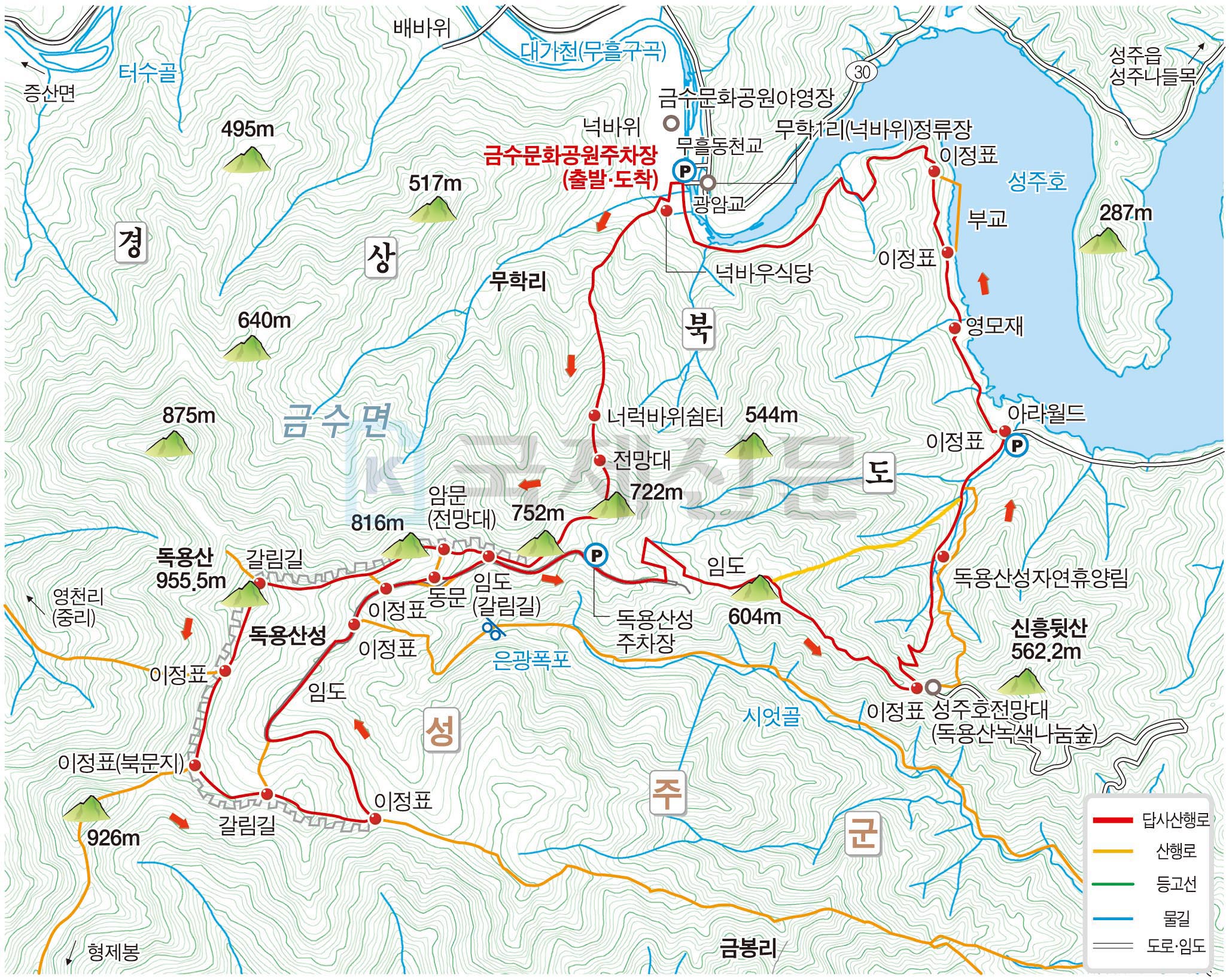 금수문화공원 주차장 - 752봉 - 독용산성 암문 - 독용산 정상 - 북문지 - 남문 갈림길 - (임도) - 동문 - 독용산성 주차장 - 임도 내려가다가 중간 샛길 - 독용산 자연휴양림 - 아라월드 입구 - 영모재 - 금수문화공원 주차장(원점회귀)