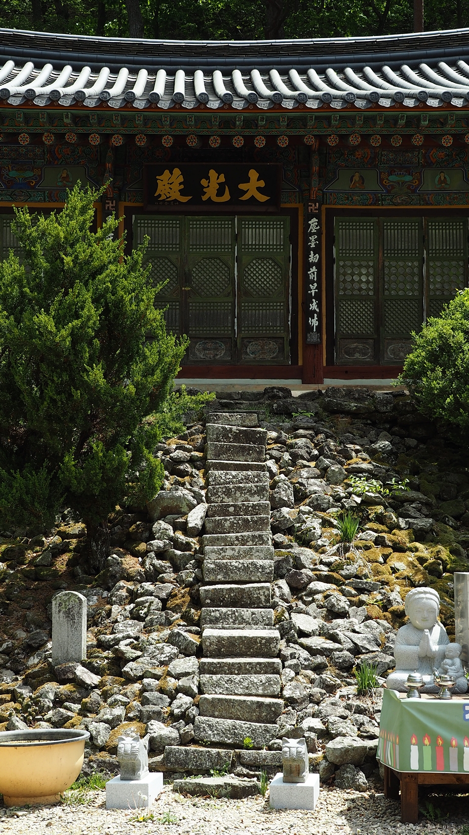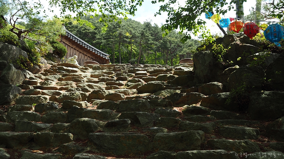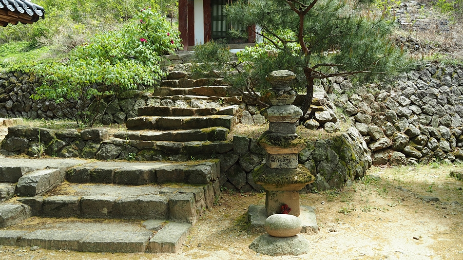 수정사 들려서 일반인들의 눈으로 가장 돋보이는 작품은 주법당 올라가는 돌계단.