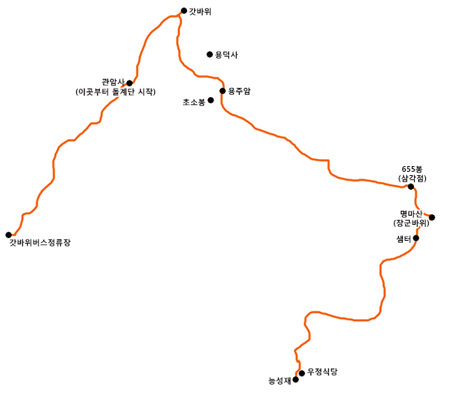 산행코스 : 능성재 주차 - (시내버스편으로 갓바위 이동) - 갓바위 주차장 - 관암사 - 갓바위 - 용주암 - 명마산(장군바위) - 능성재(차량회수)