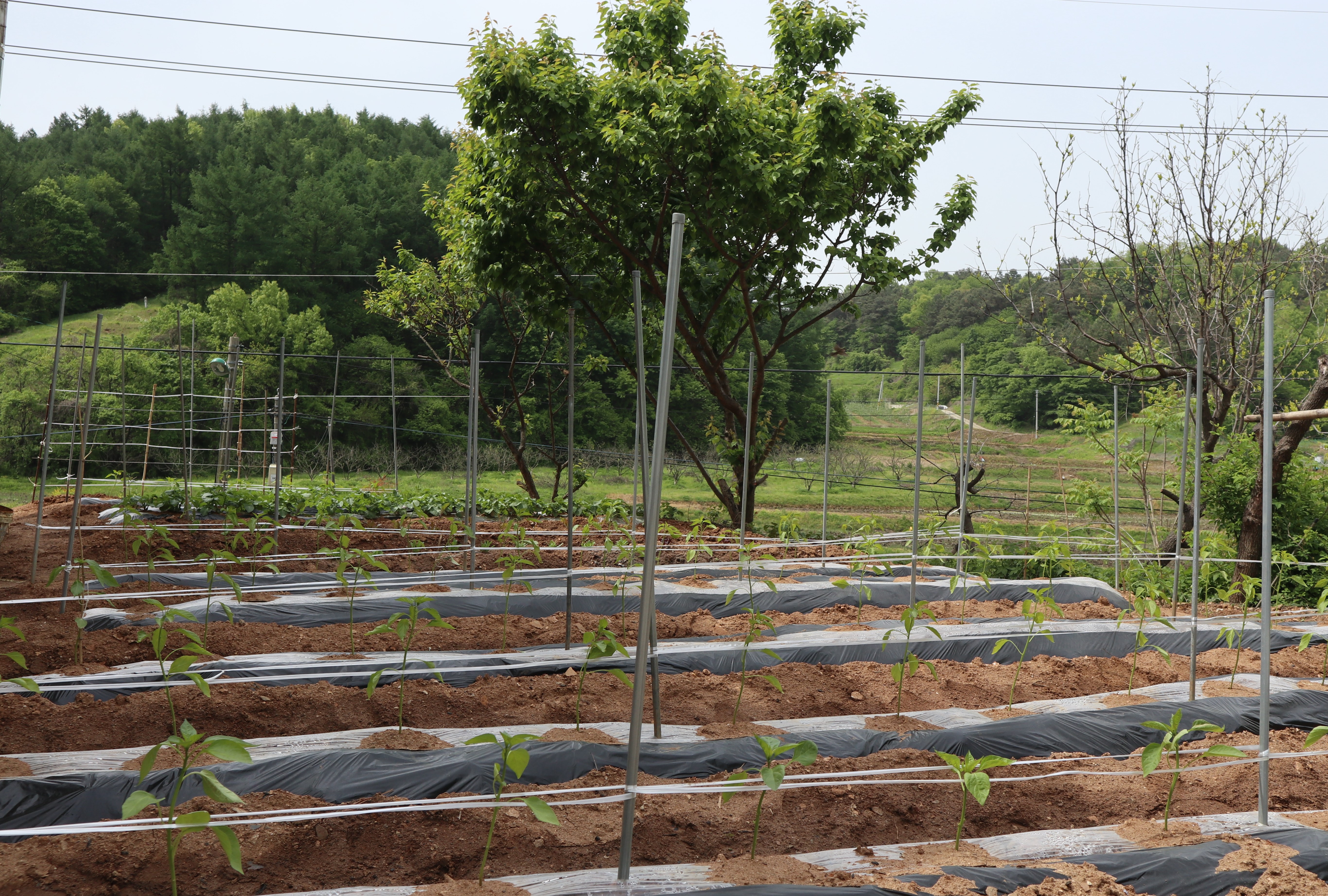오후에 고추 지지대를 세우고 1차 묶음 작업을 했습니다.