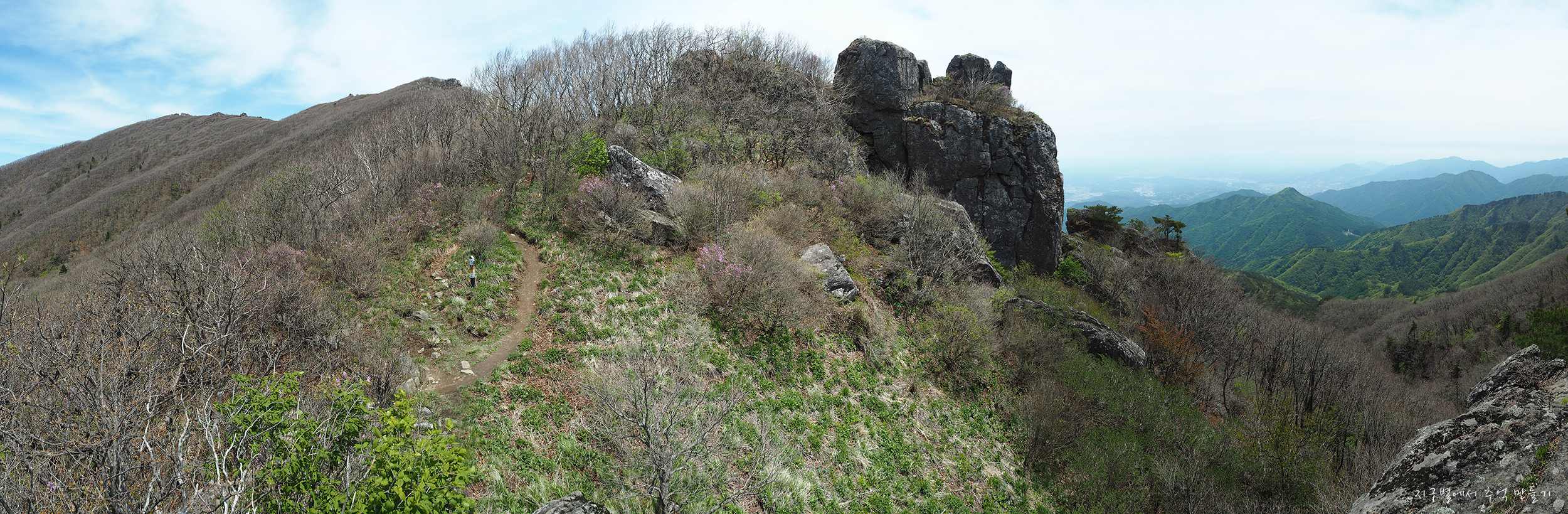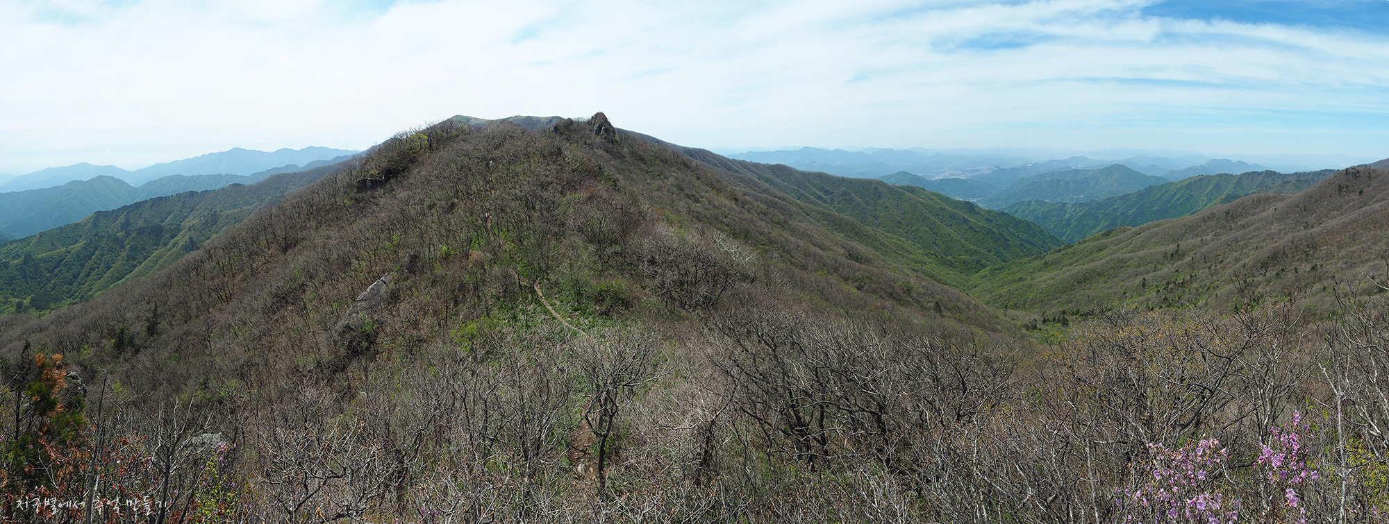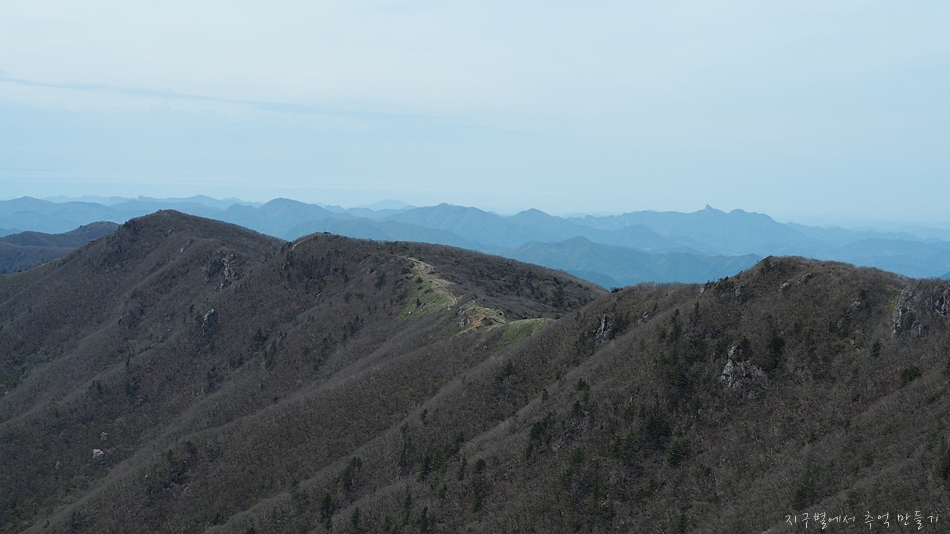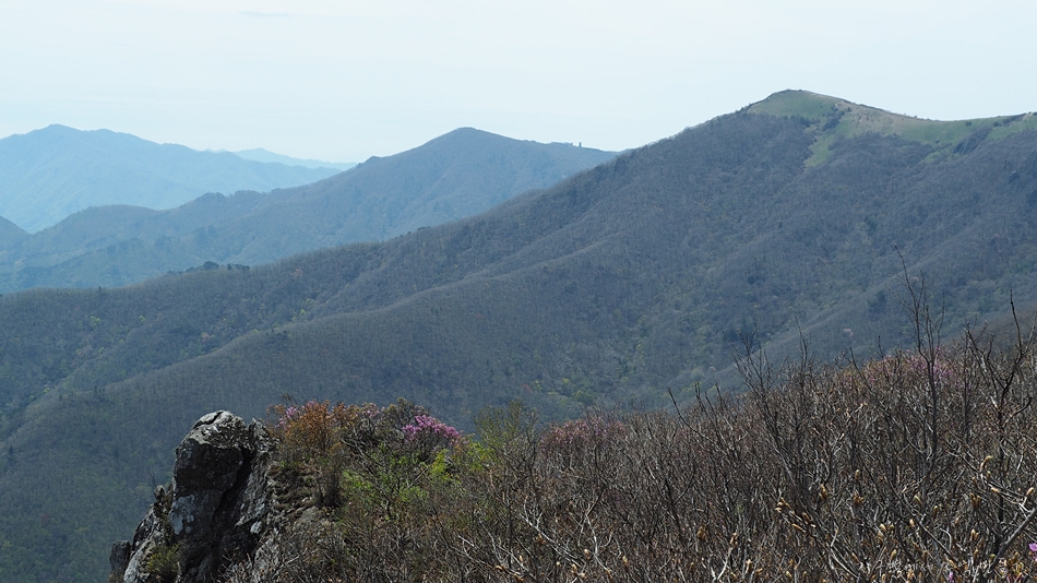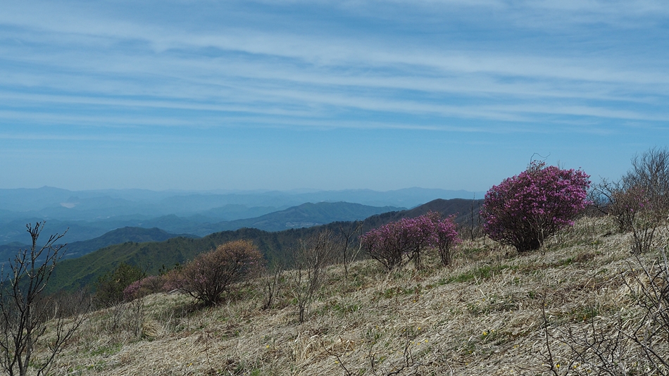 진달래가 군락은 아니지만 이곳 저곳 피어서 회색빛 산자락을 완전 돋보이게 만드네요.