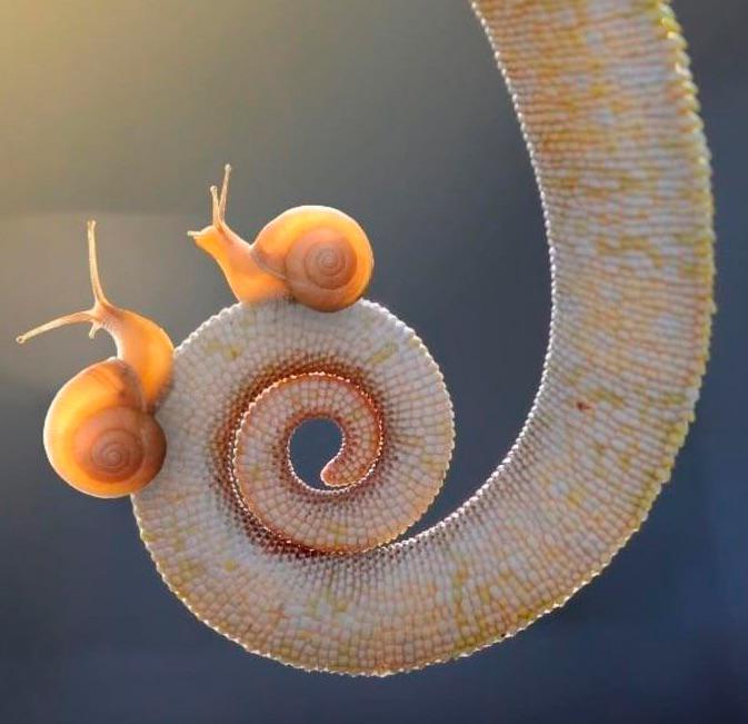 3. 카멜레온 꼬리에 붙은 2마리의 작은 달팽이