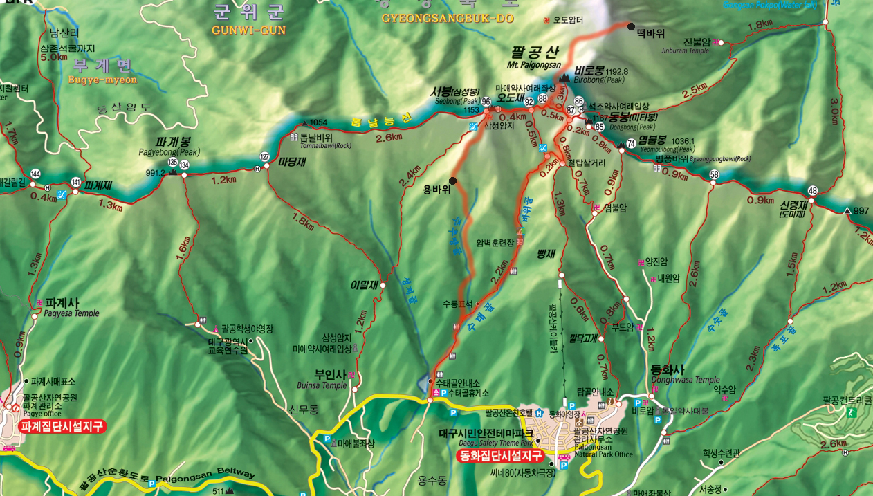 빨강색으로 표시한 구간이 산행한 코스.