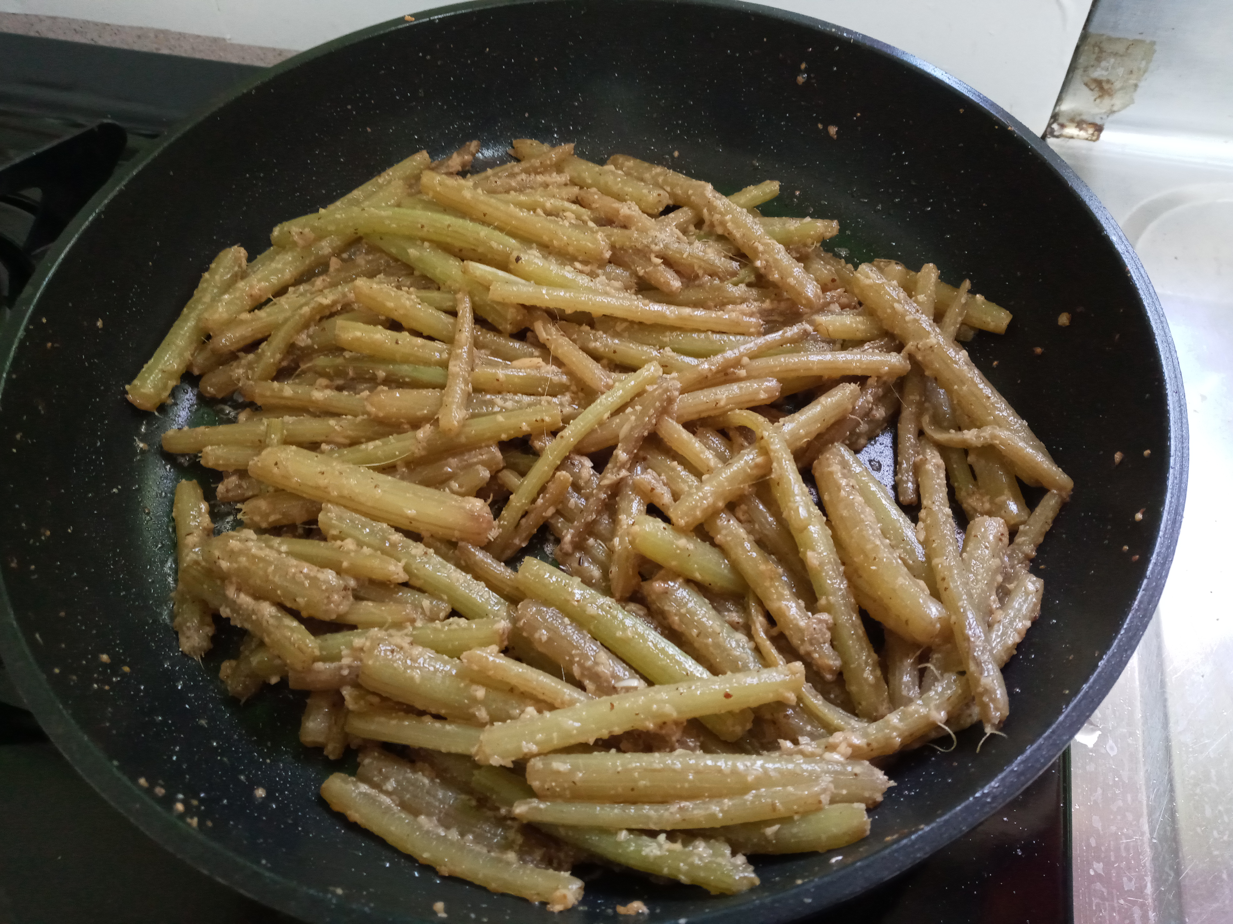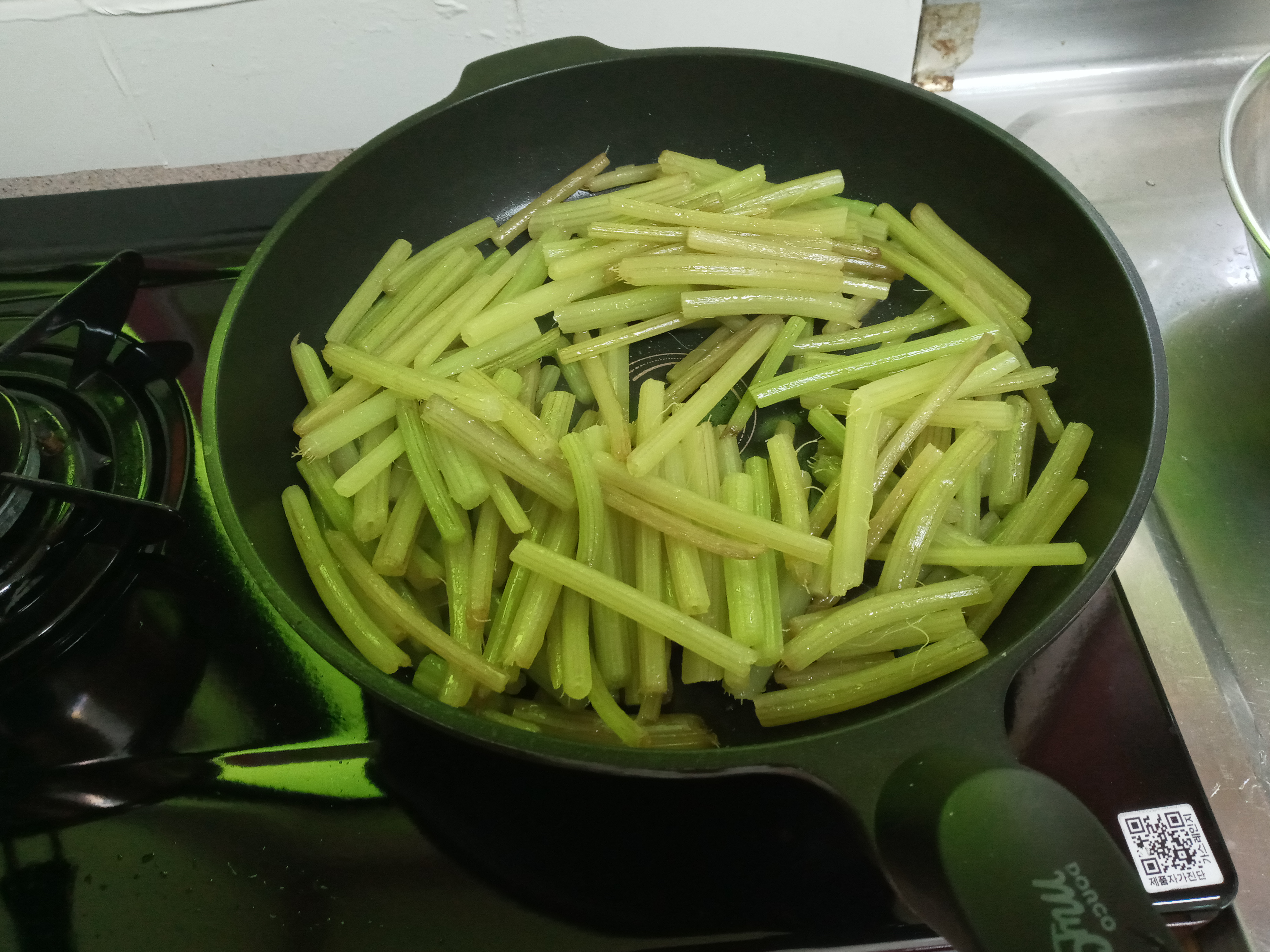 살짝 삶은 줄기 껍질을 벗겨 들기름으로 볶다가 들깨, 마늘, 깨소금을 넣고 볶았습니다.
