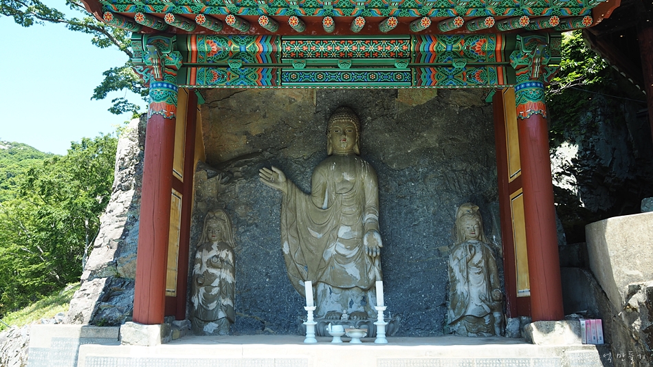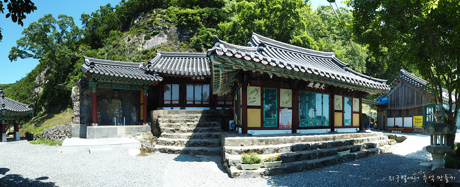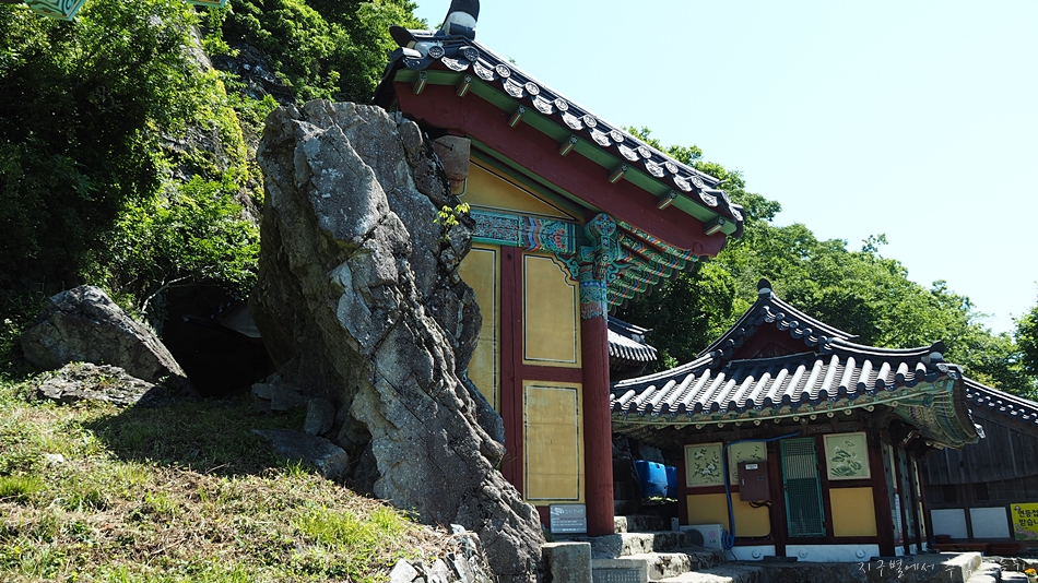 비스듬한 바위를 뒷벽으로 하고 암자가 지어져 있습니다.