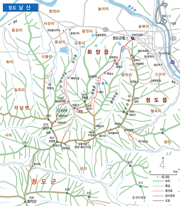청도군청 - 용화사 - 대포산 - 봉수대 - 삼면봉 - 남산 정상 - 신둔사 - 은왕봉 고개 - 낙대폭포 - 청도군청(원점회귀)