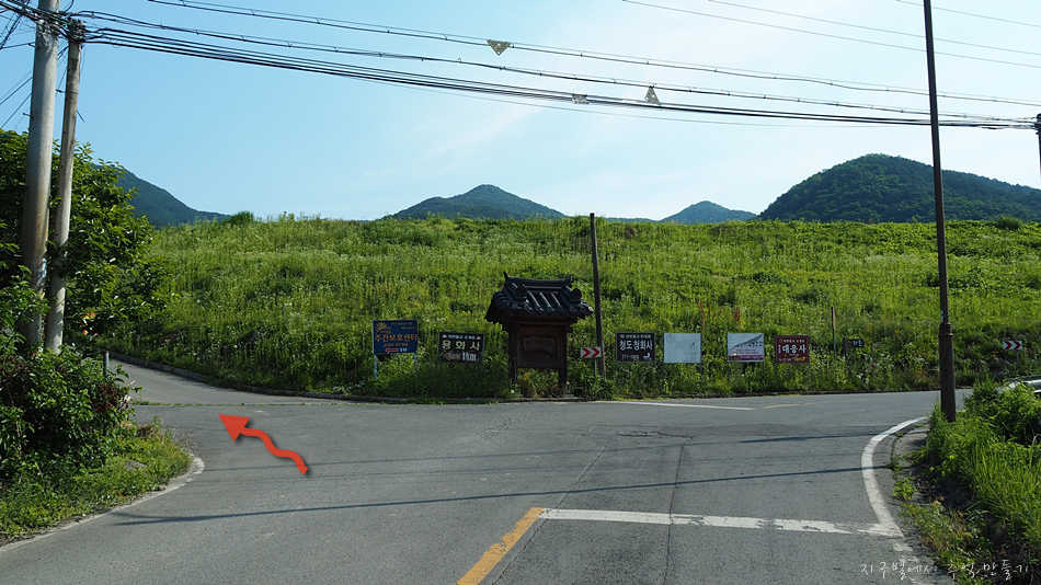 주차 후 산쪽 방향으로 500m 정도 도로를 따라 주~욱 걸어가면 앞쪽에 저수지 둑이 가로방향으로 보이고 이곳에서 좌측 용화사라고 가르키는 곳의 임도를 따라 오르면 됩니다.
