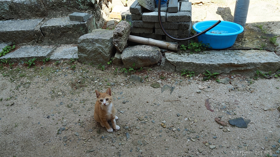 사람 인기척이라고는 전혀 없는 고요한 절집에서 물이라도 한잔 하고자 수도꼭지를 틀어 마시고 있으니 어디에서 나타났는지 아기 고양이가 앞에서 쳐다보고 있습니다.