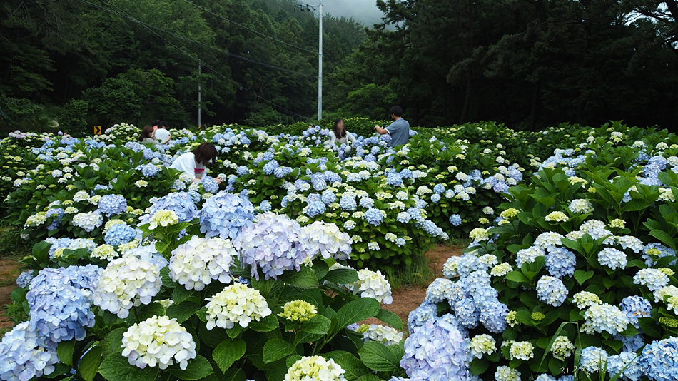 도로가에 펼쳐진 수국밭에서는 지나가는 차들이 잠시 멈춰서 사진을 찍고 갑니다.