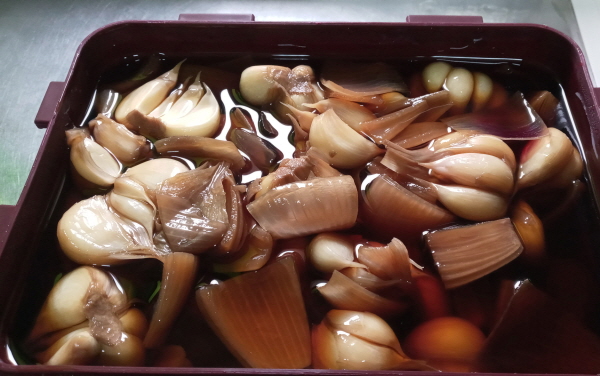 장터에 가니 싱싱한 생마늘을 구입해서 양파도 넣어서 마늘양파 장아찌를 담았습니다.