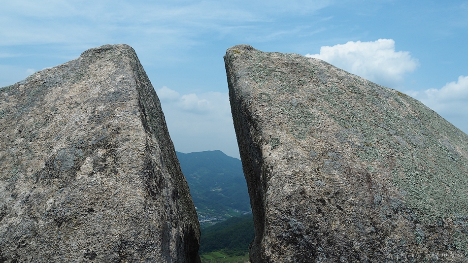 칼로 쪼갠 듯 커다란 바위가 두 동강이 나 있는데 뒤로 절벽이라 전체적인 모습을 담을 수 없네요.