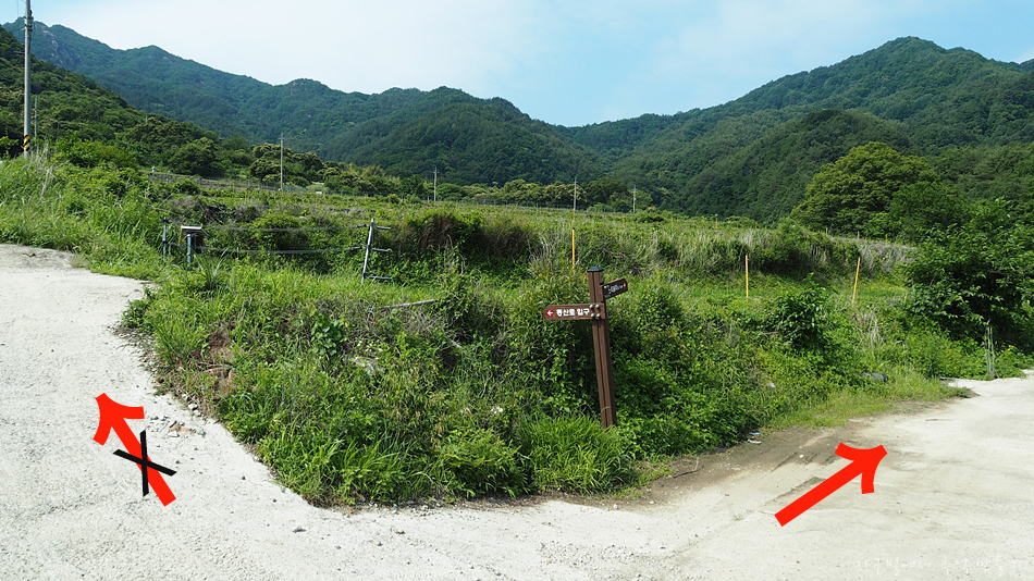 이곳에서 좌측으로 오르면 밤나무 단지들로 연결된 임도들이 등산로와 많이 헷갈리게 되어 있으므로 초행시에는 오른편으로 이동하는 게 좋습니다.