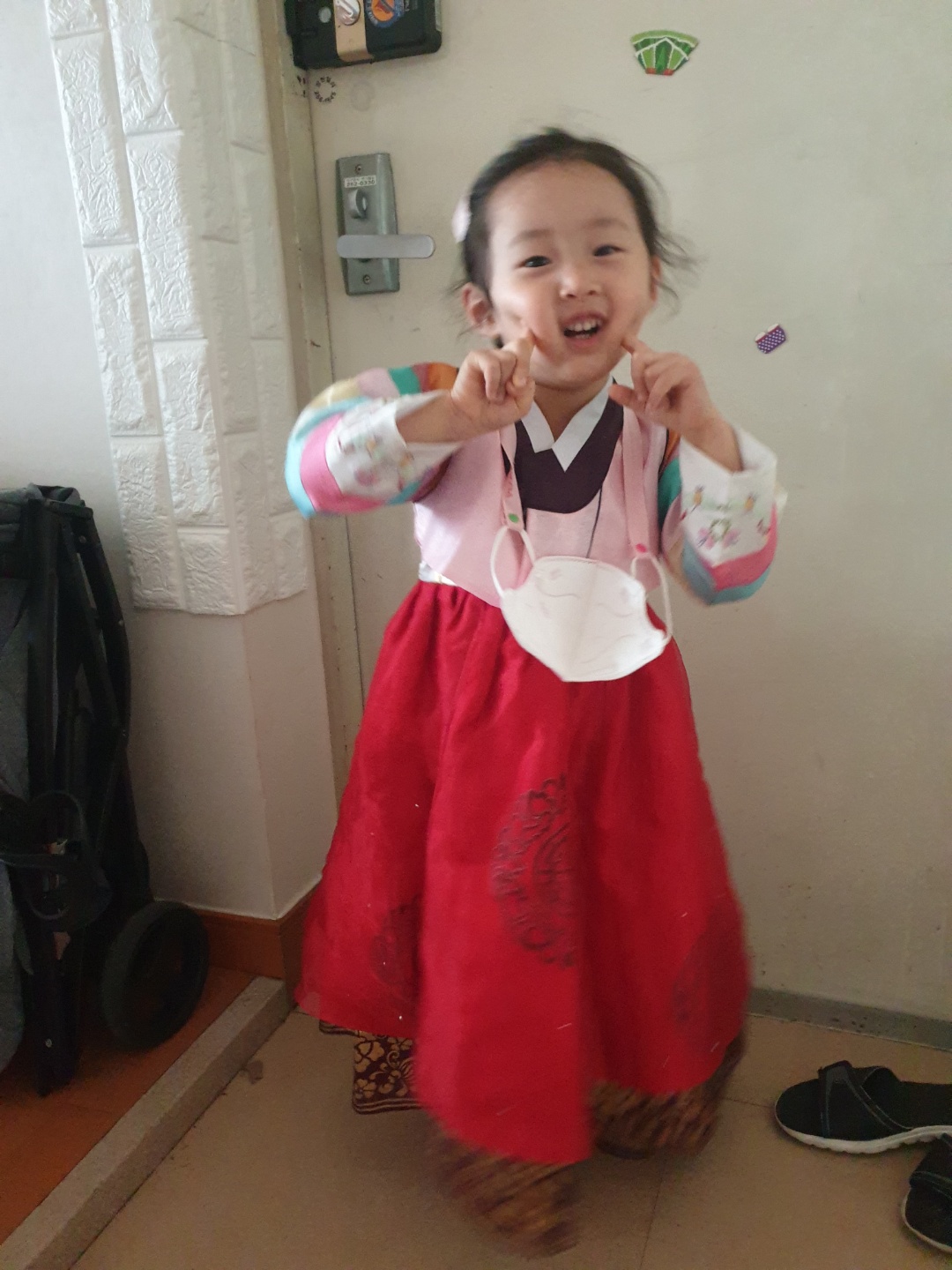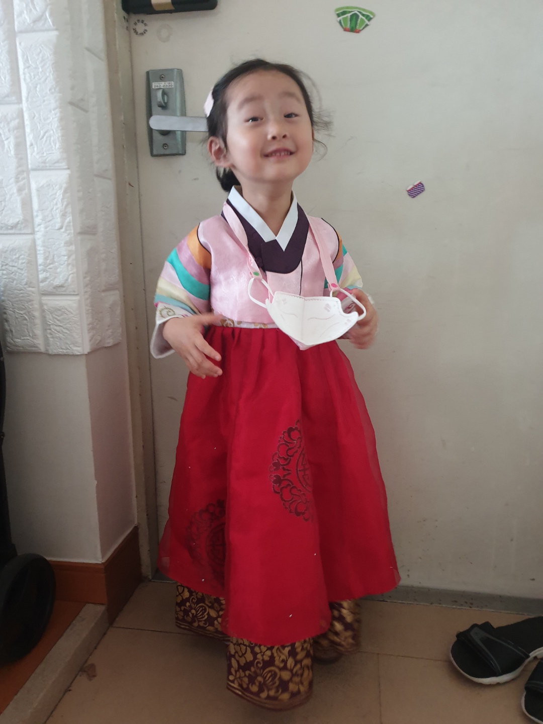 아침부터 어린이 집 등원을 한복 입고 간다고 하도 생떼를 피워서 입혀 주었다고 합니다.