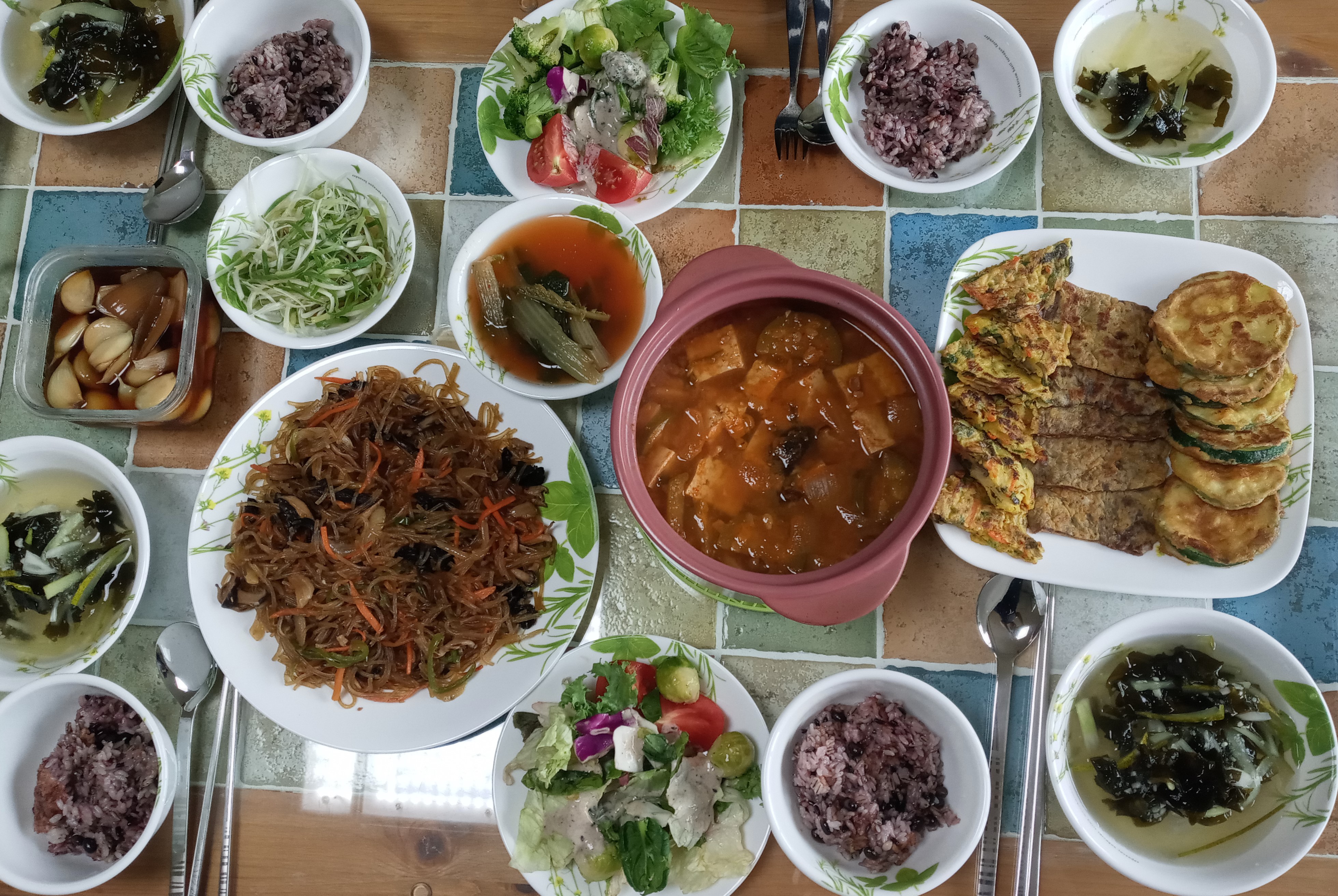비건인 큰 딸은 고기 없는 잡채와 된장찌개를 준비하고..